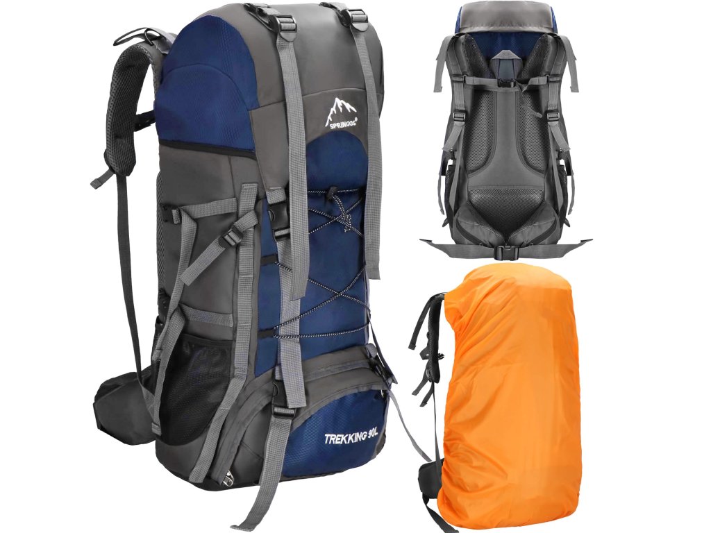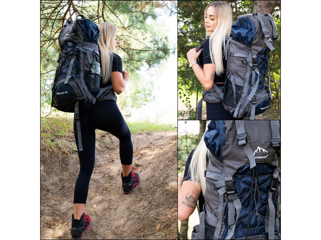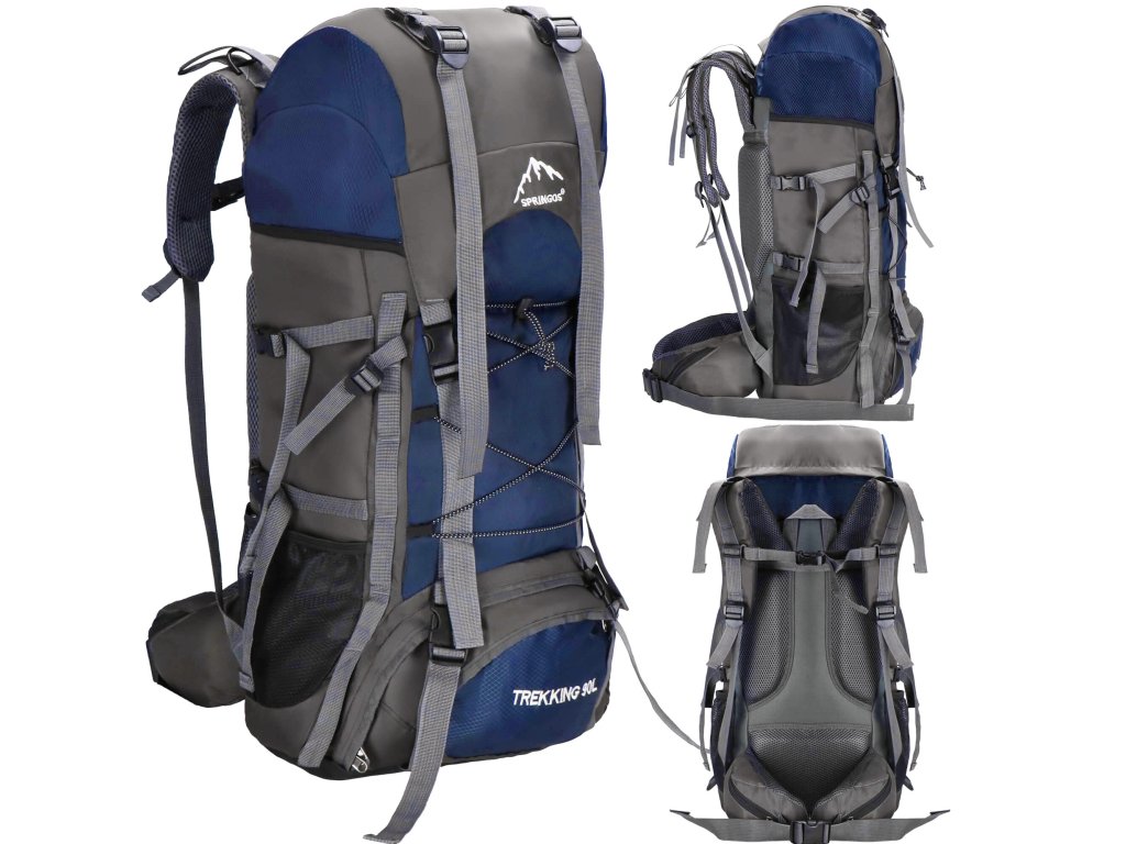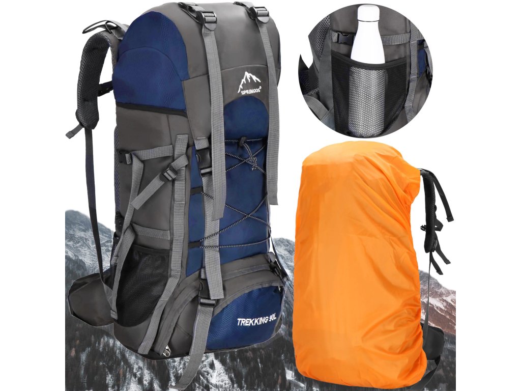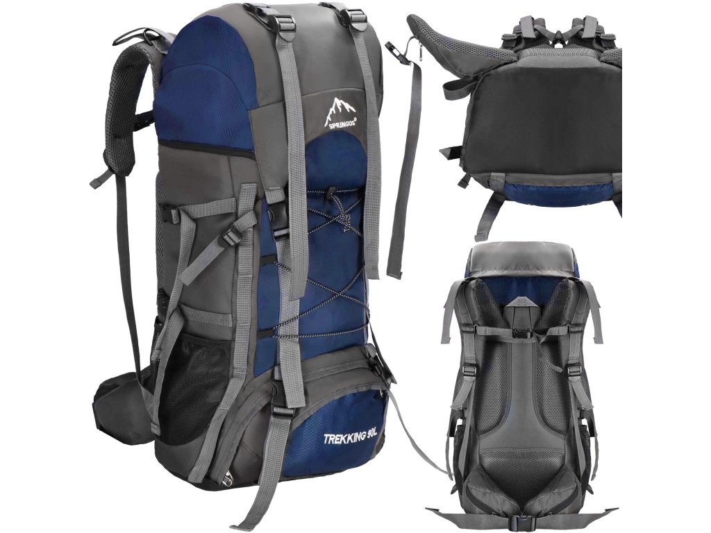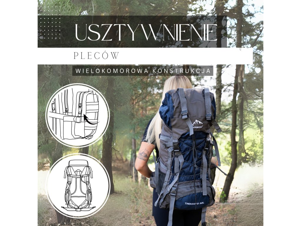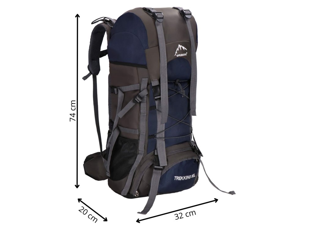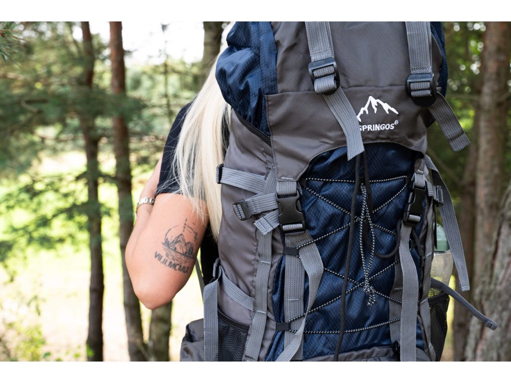 - În partea superioară din fața clapetei, logo brodat alb Springos, în partea de jos inscripția TREKKING 90L.