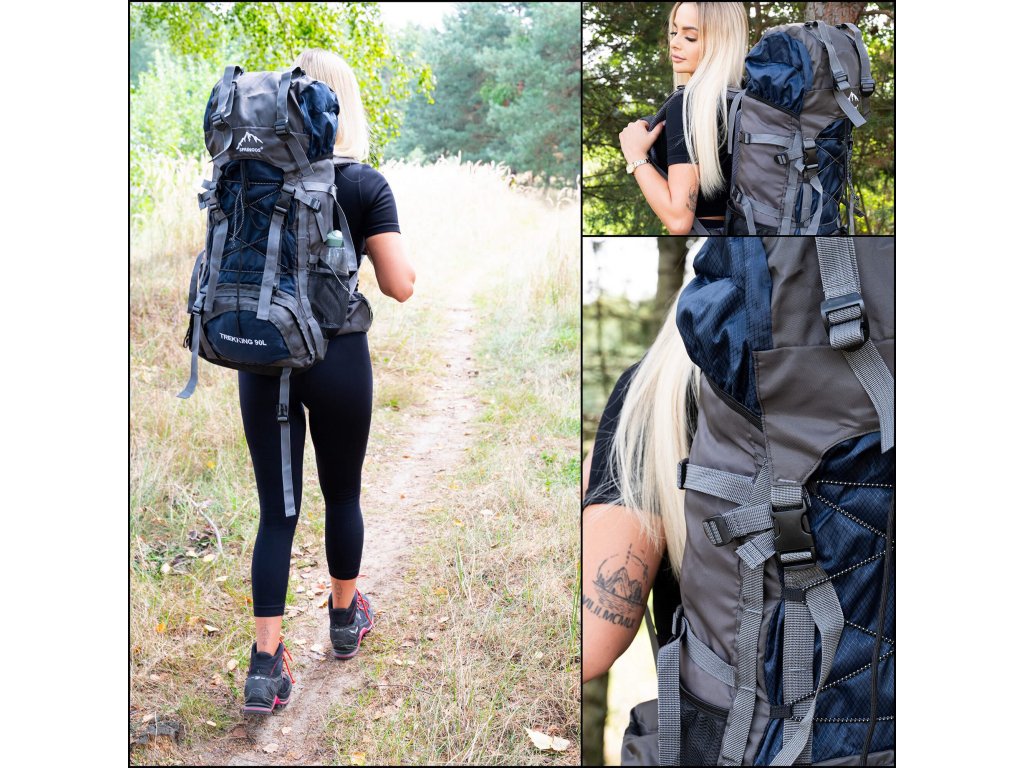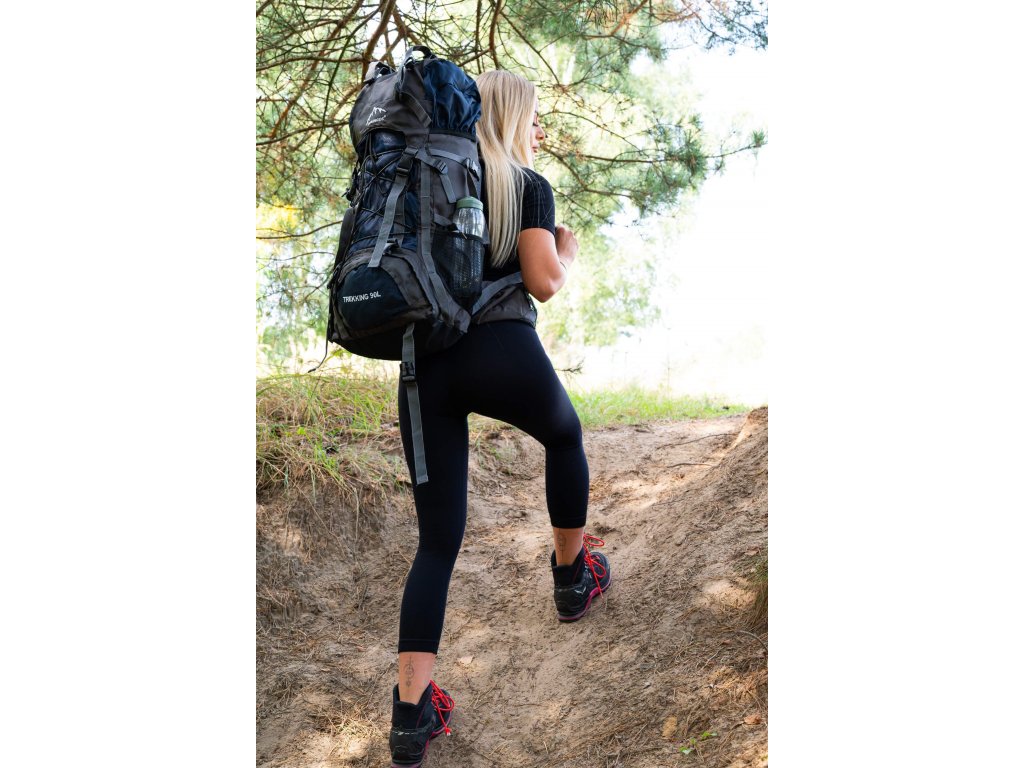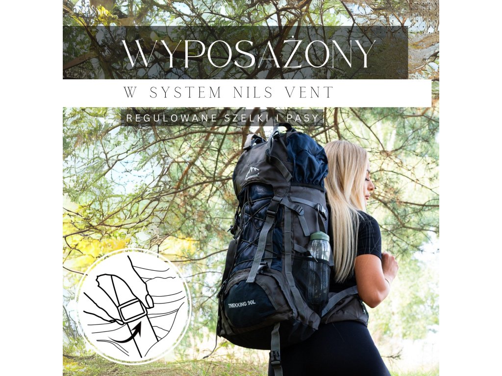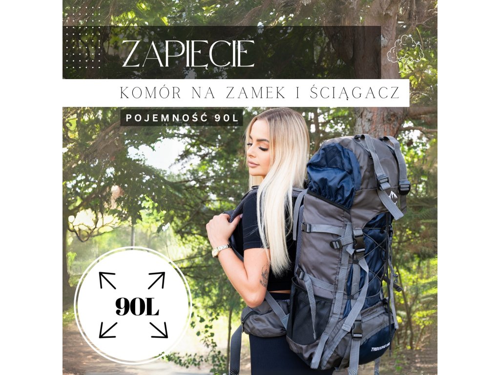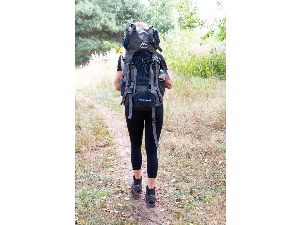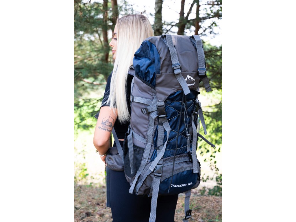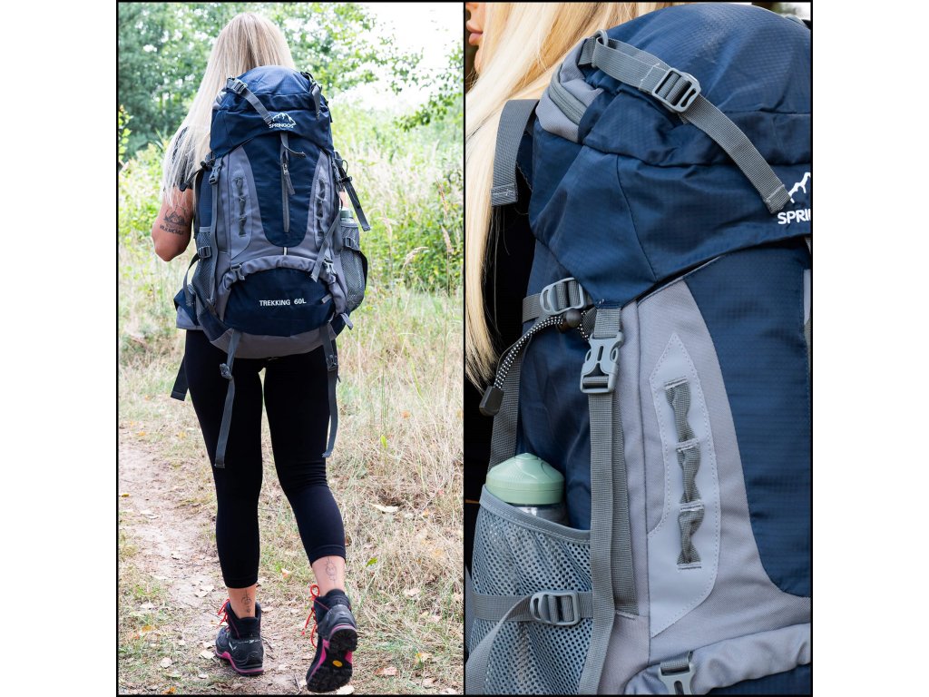 - În partea superioară din fața clapetei, logo brodat alb Springos, în partea de jos inscripția TREKKING 90L.