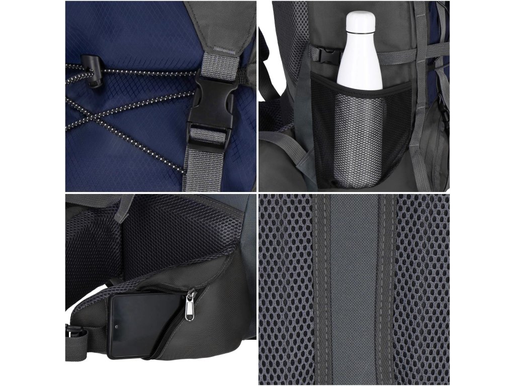 - Trei compartimente: compartiment principal cu acces din partea superioară și inferioară, compartiment inferior pentru husă de ploaie, compartiment în partea superioară a clapetei.