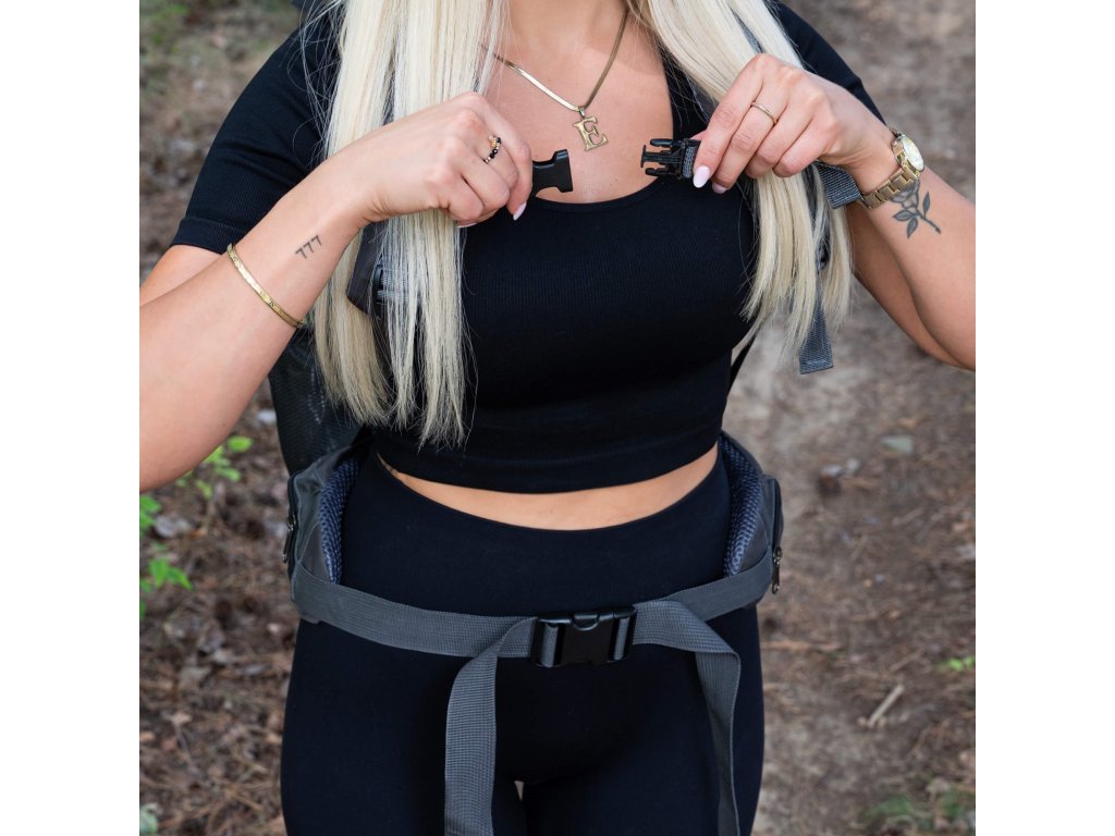 - Posibilitatea de a prinde bretelele în fața corpului (curea cu elastic cusut).