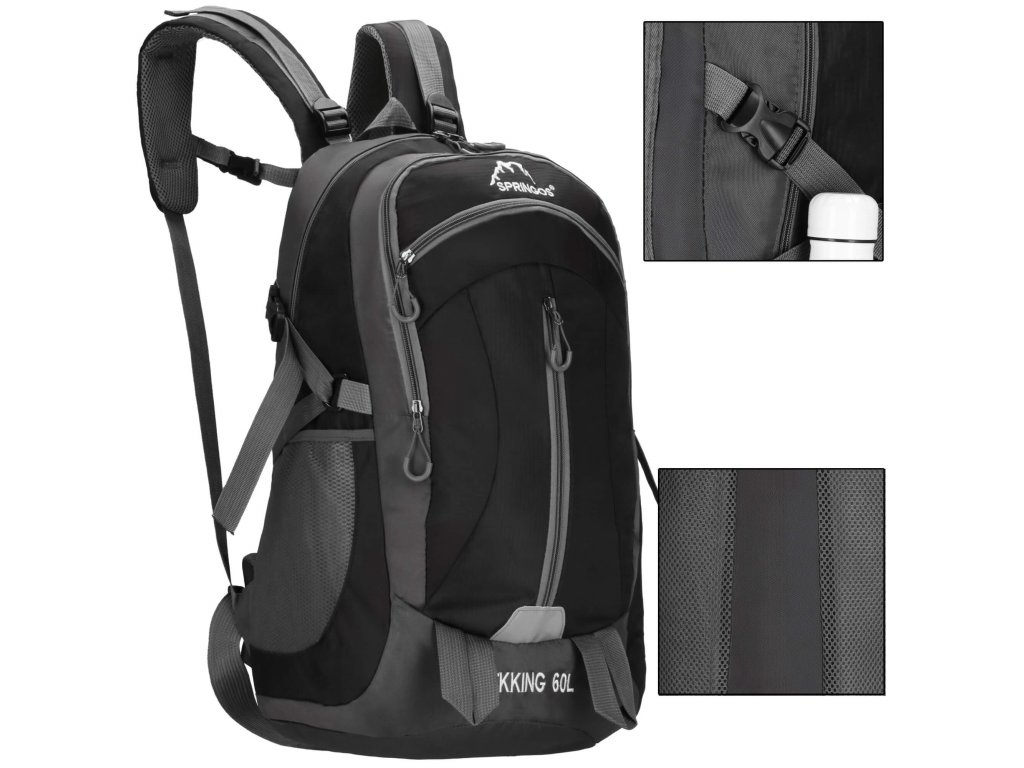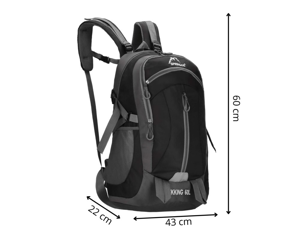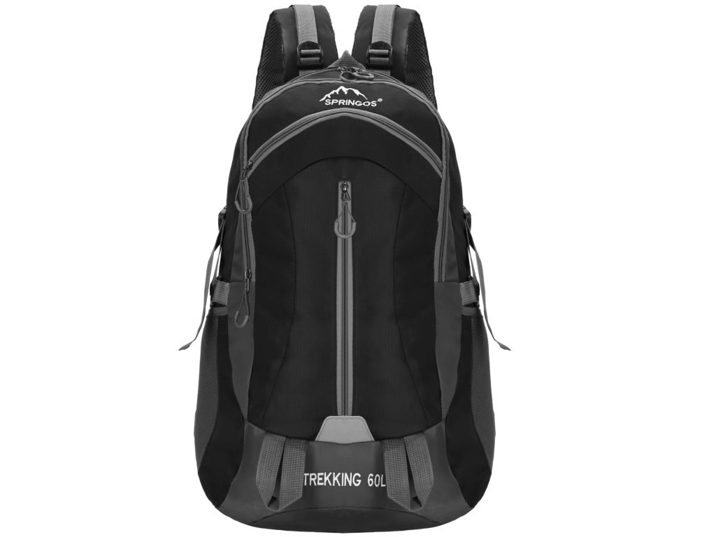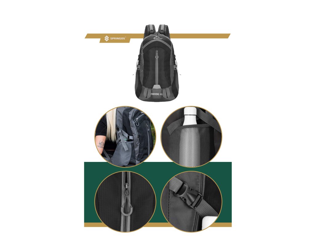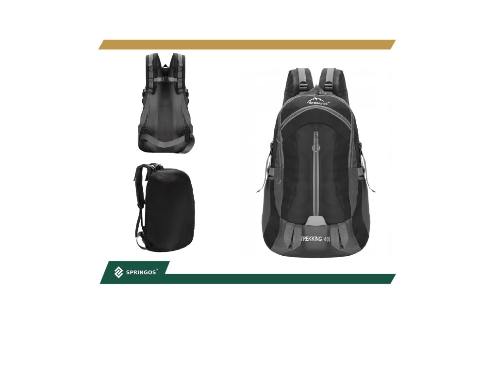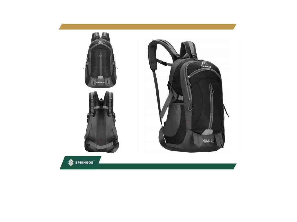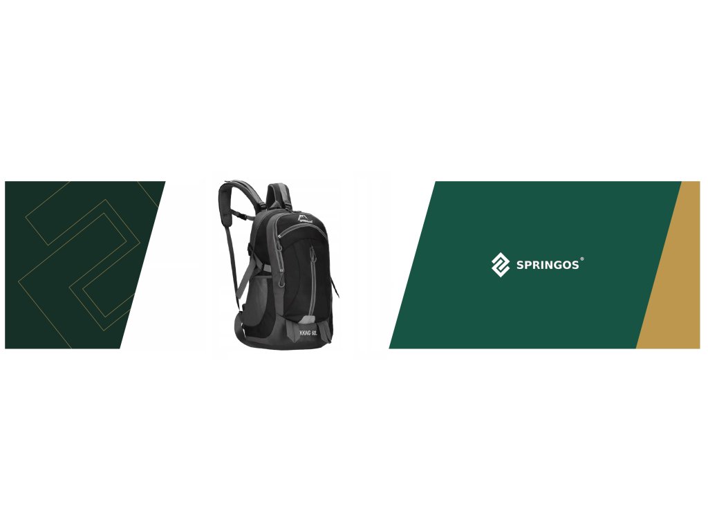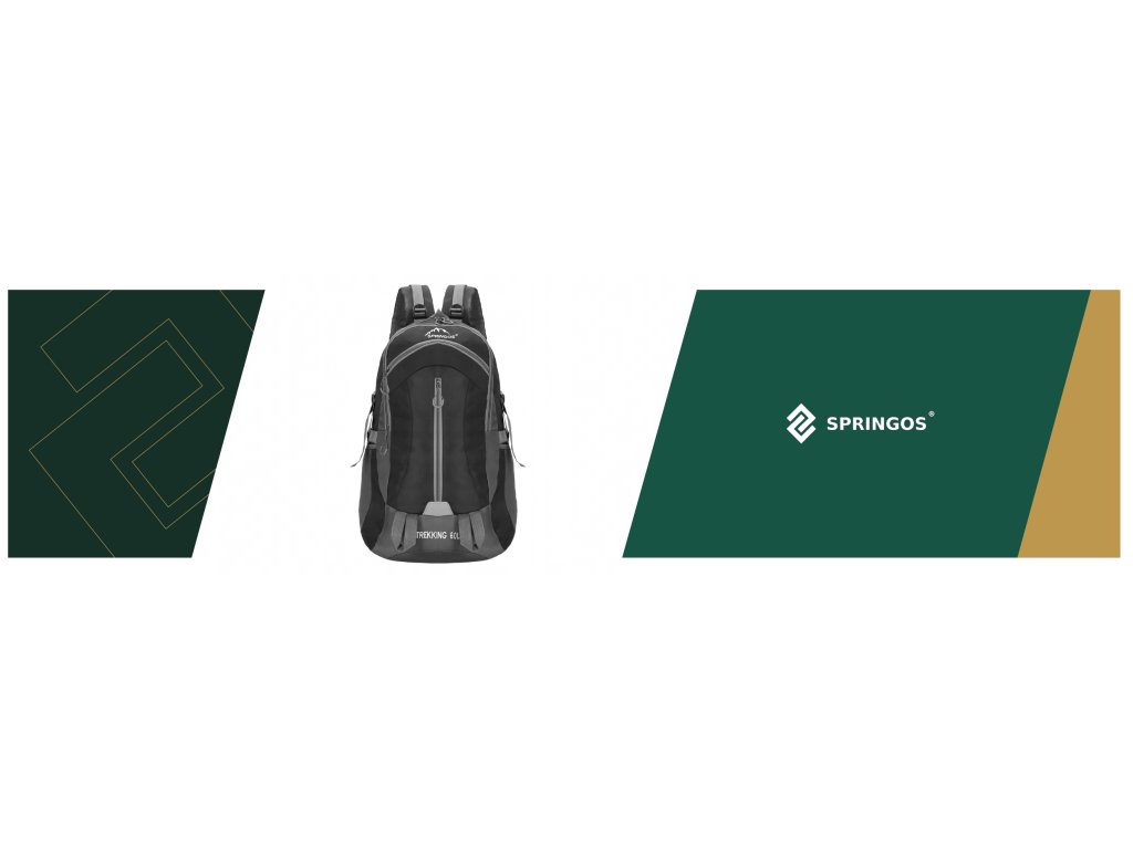 - În partea superioară, logo-ul alb brodat Springos, iar în partea inferioară inscripția TREKKING 60L.