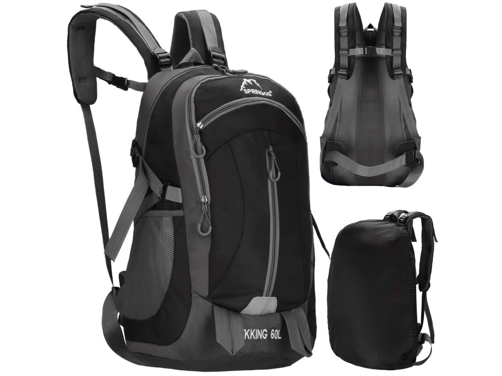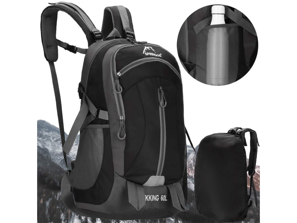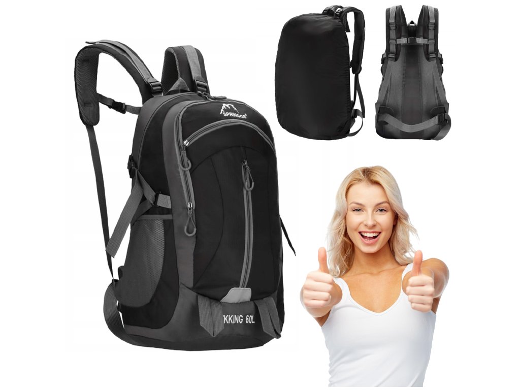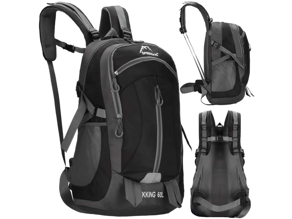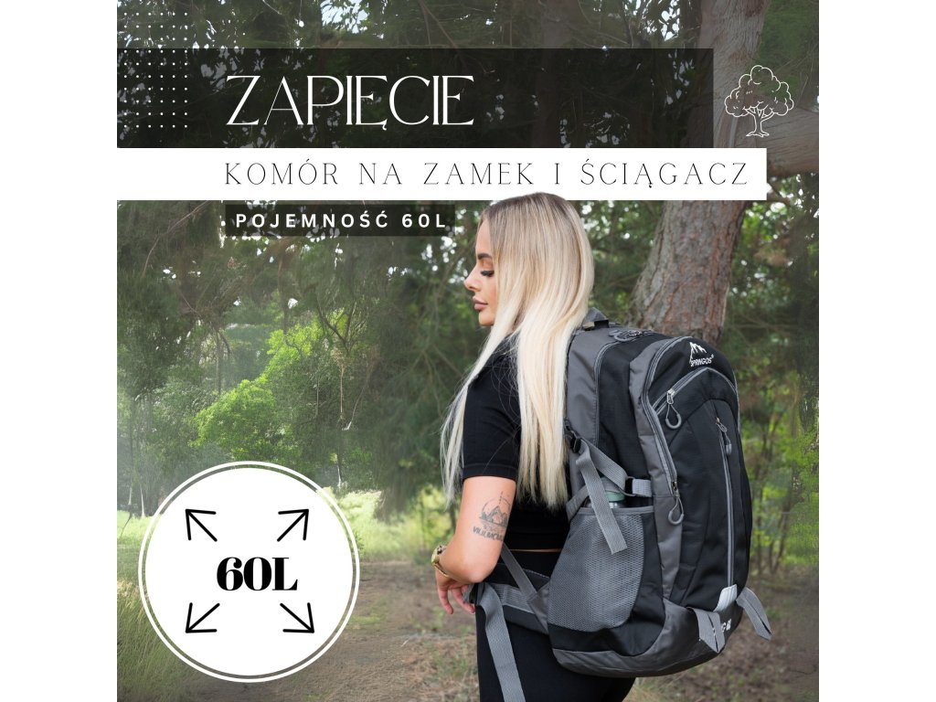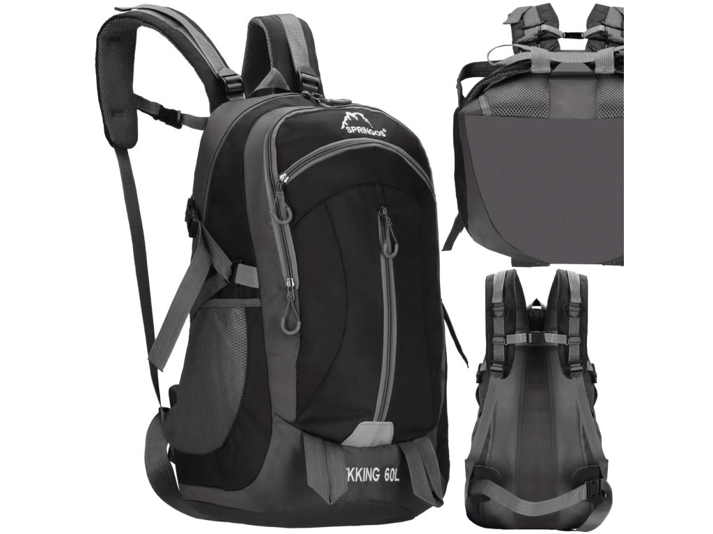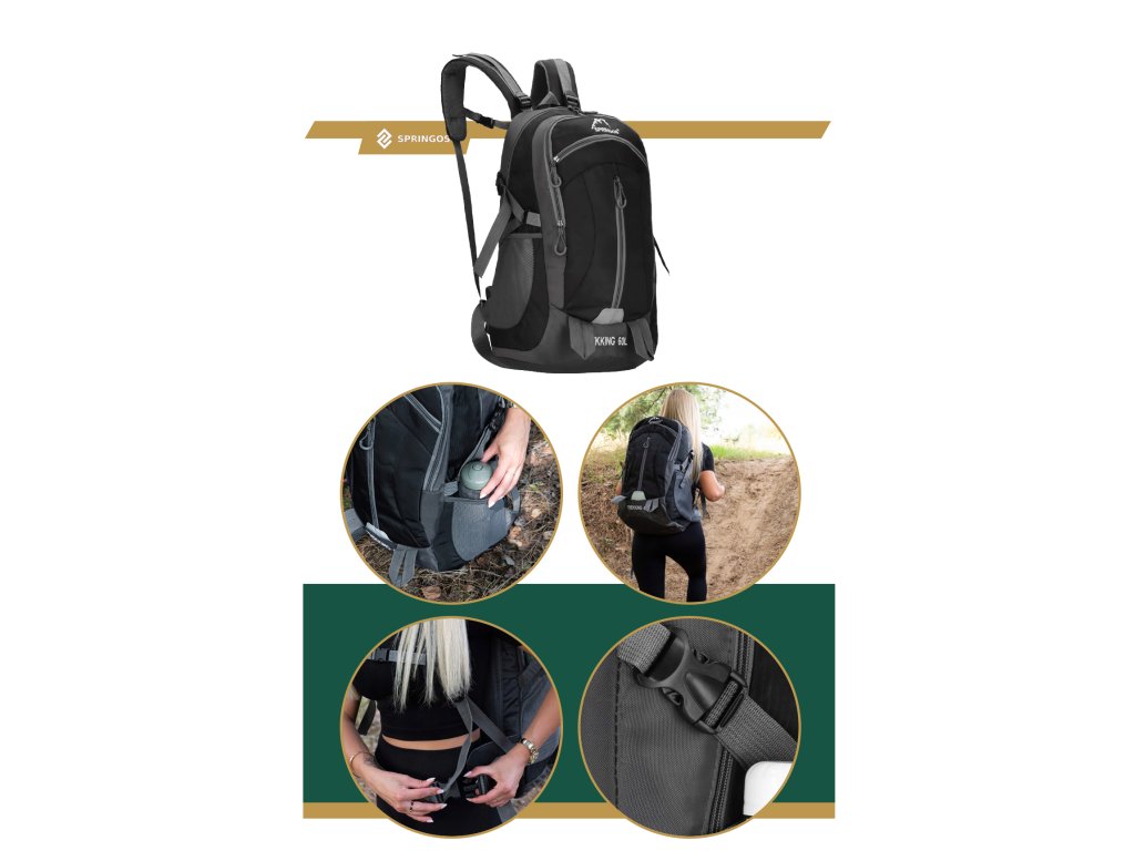 - În partea superioară, logo-ul alb brodat Springos, iar în partea inferioară inscripția TREKKING 60L.