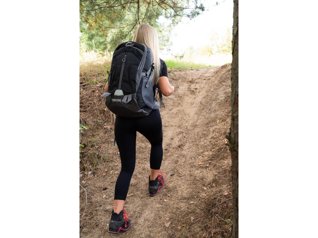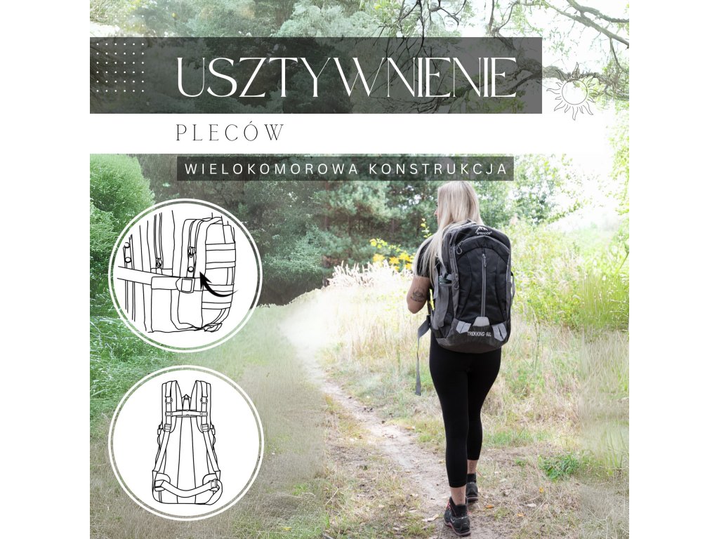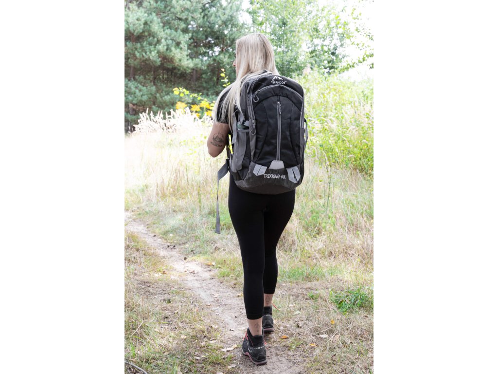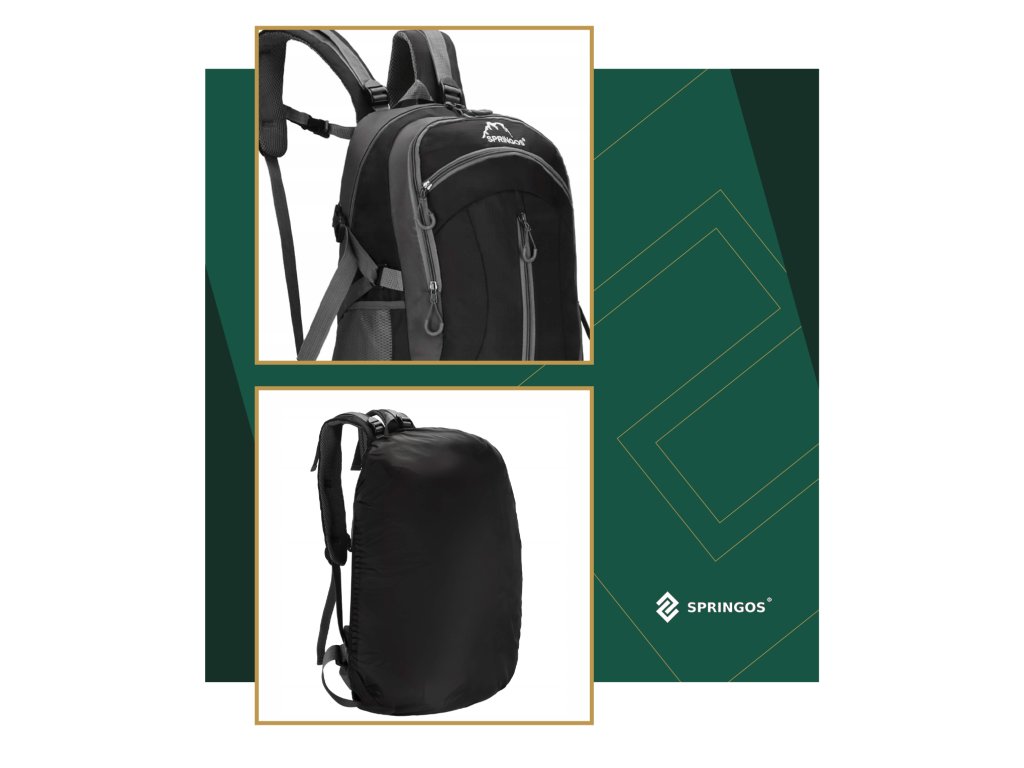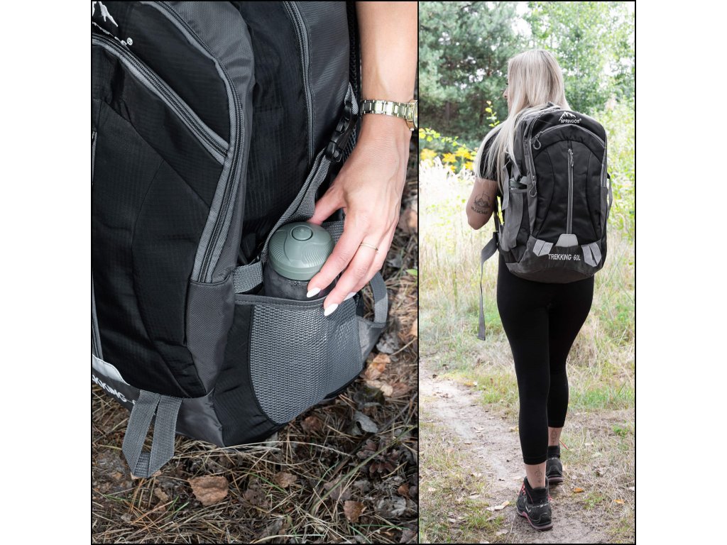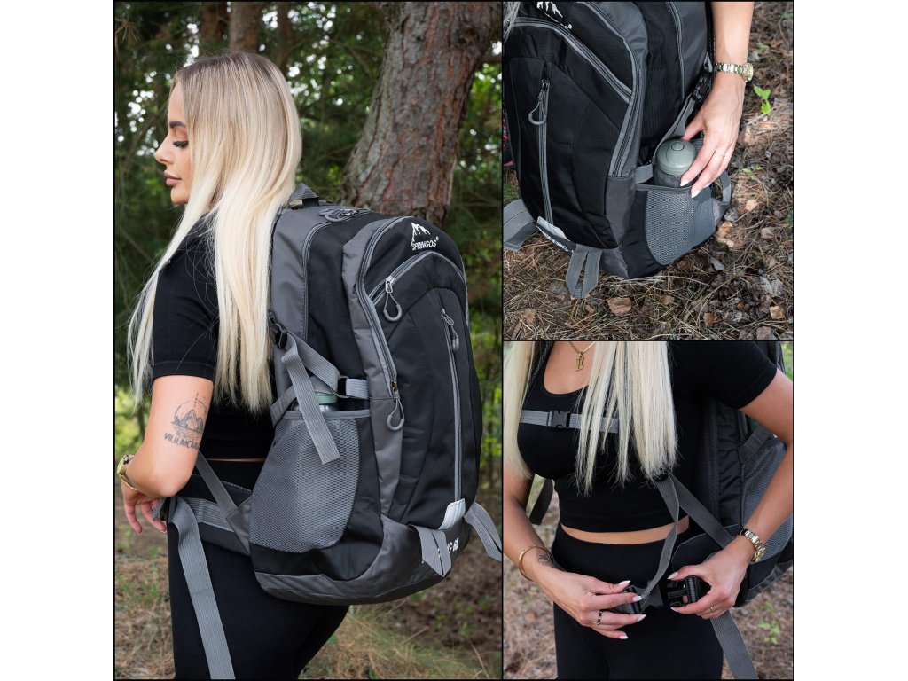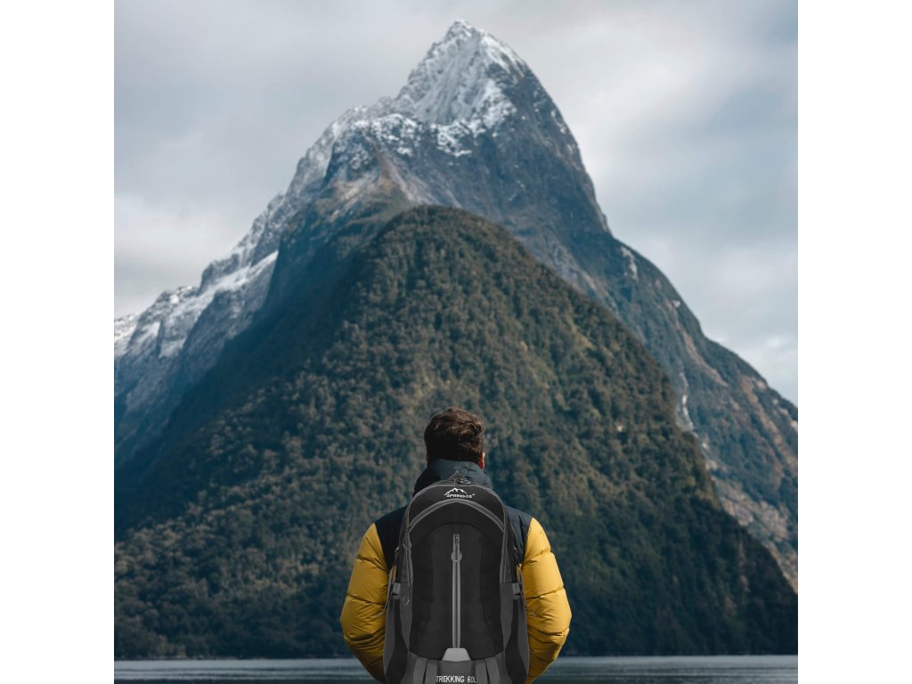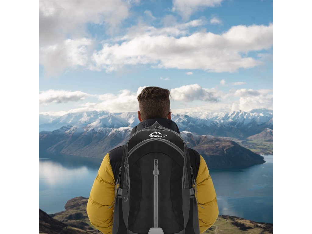 - În partea superioară, logo-ul alb brodat Springos, iar în partea inferioară inscripția TREKKING 60L.
