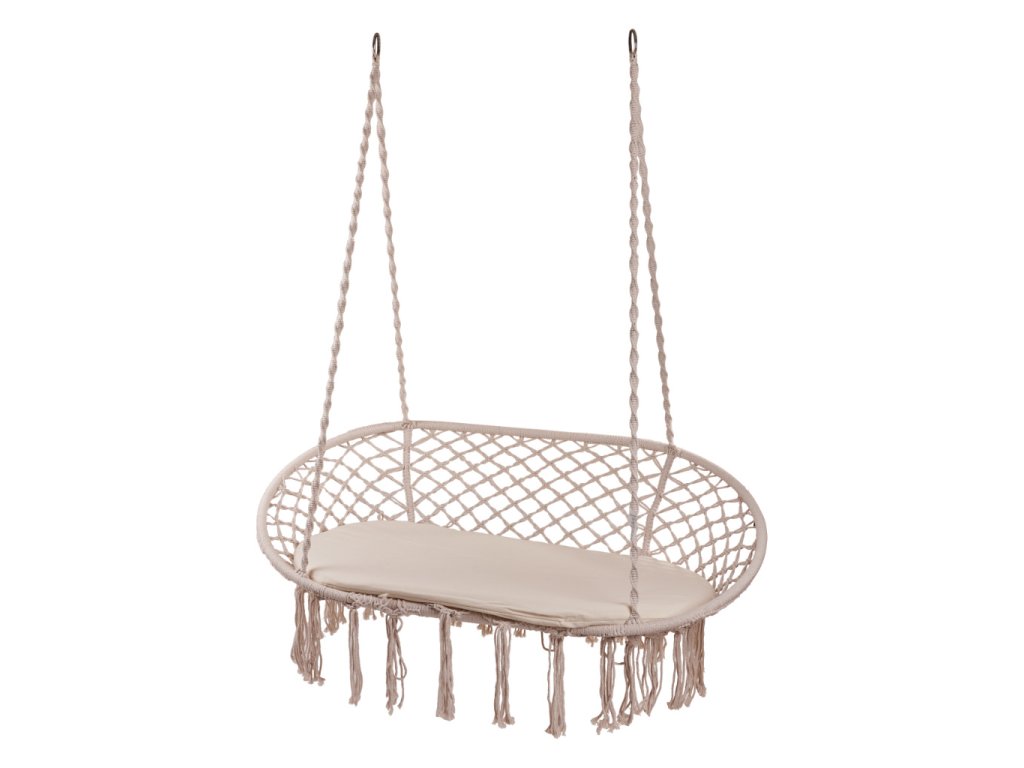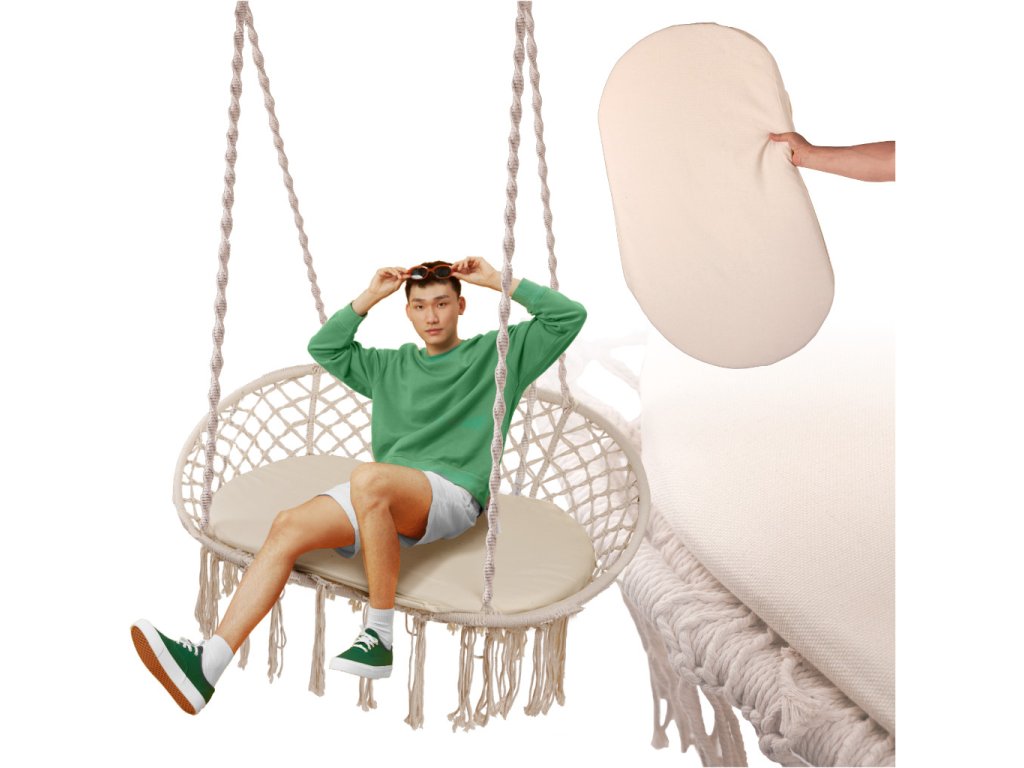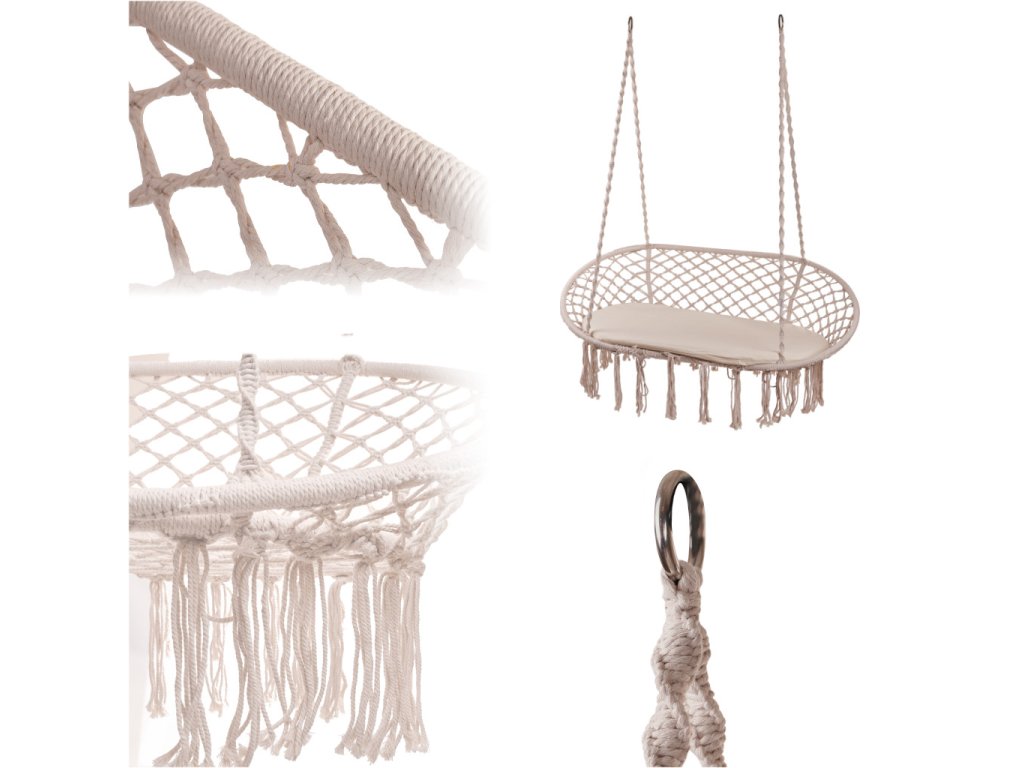 Stil boho - culoarea bej și ciucurii eleganți din jurul bazei fac din leagăn o frumoasă decorațiune pentru orice grădină.