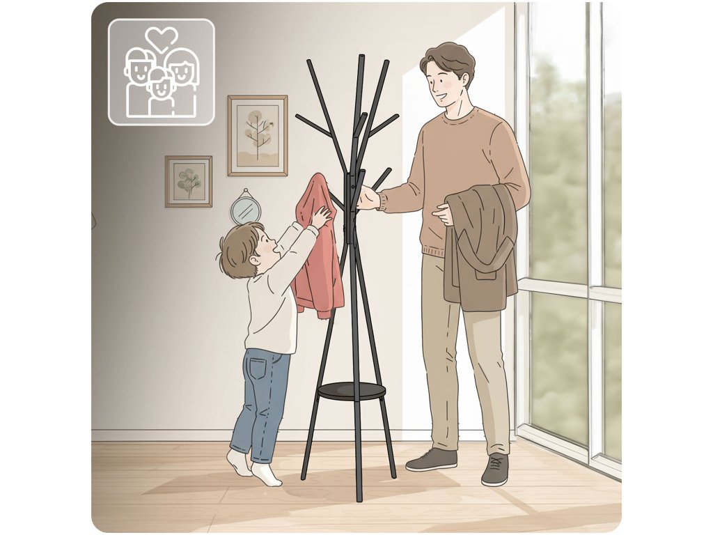 Ideal se potrivește și pentru o familie cu copii, datorită înălțimii sale ergonomice.Copiii vor ajunge cu ușurință la cârligele mai joase.
