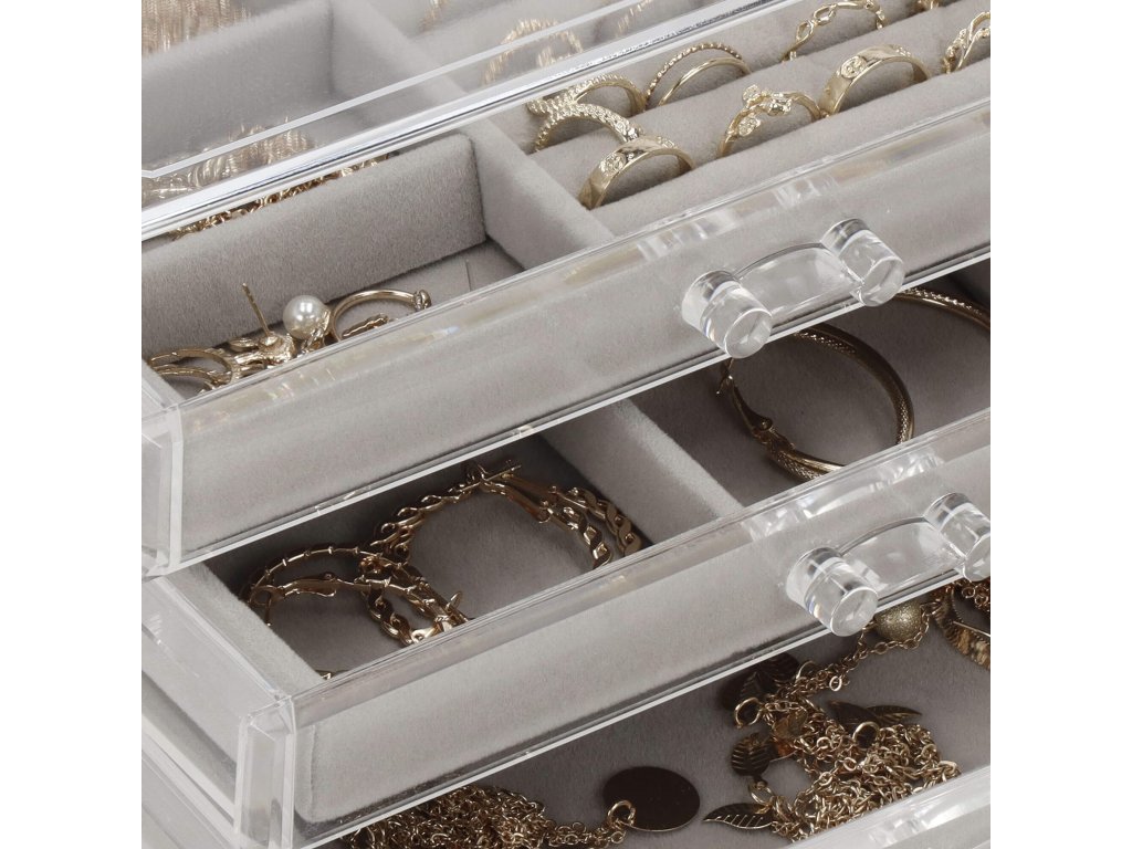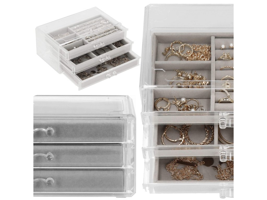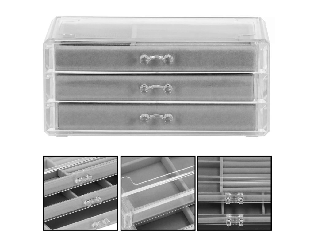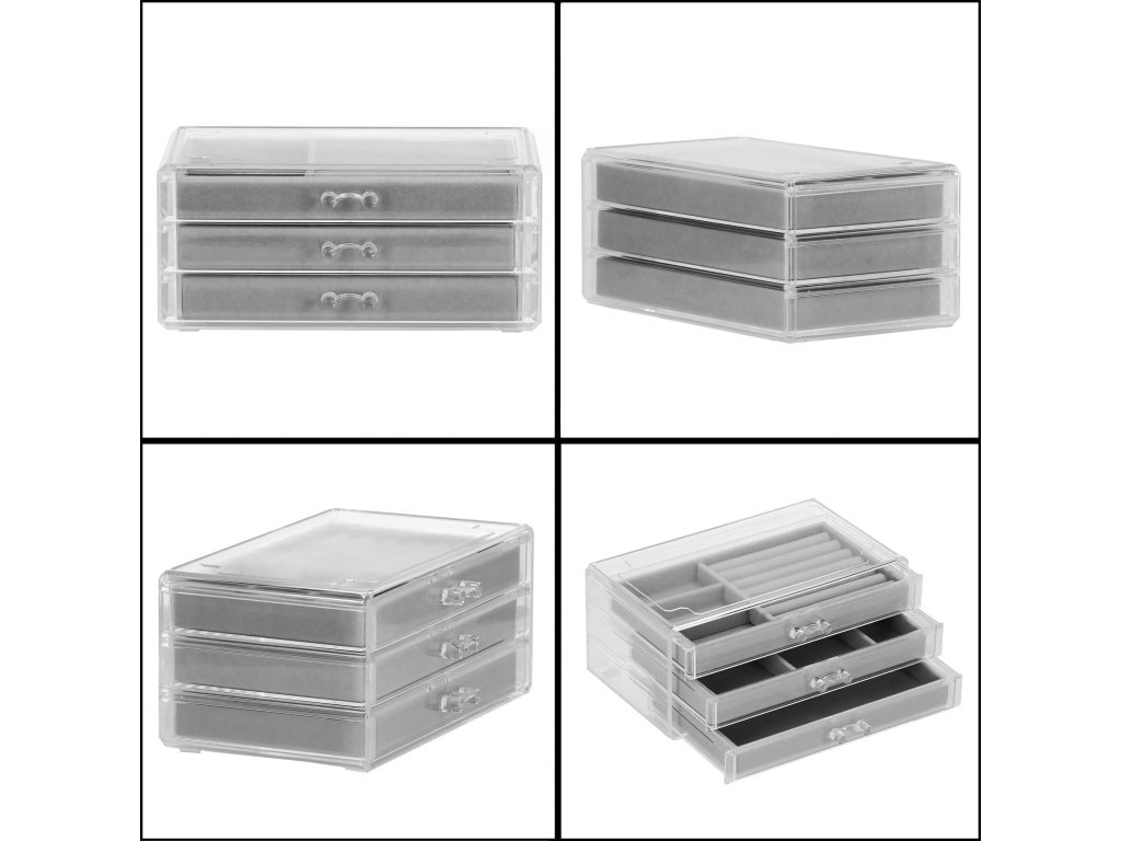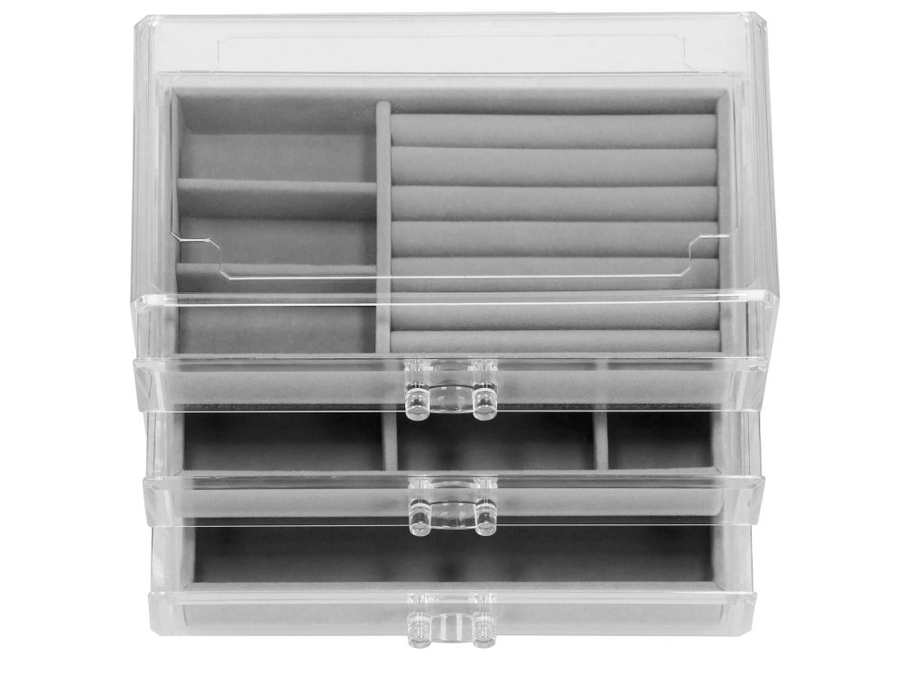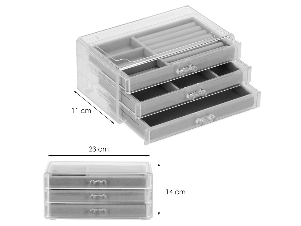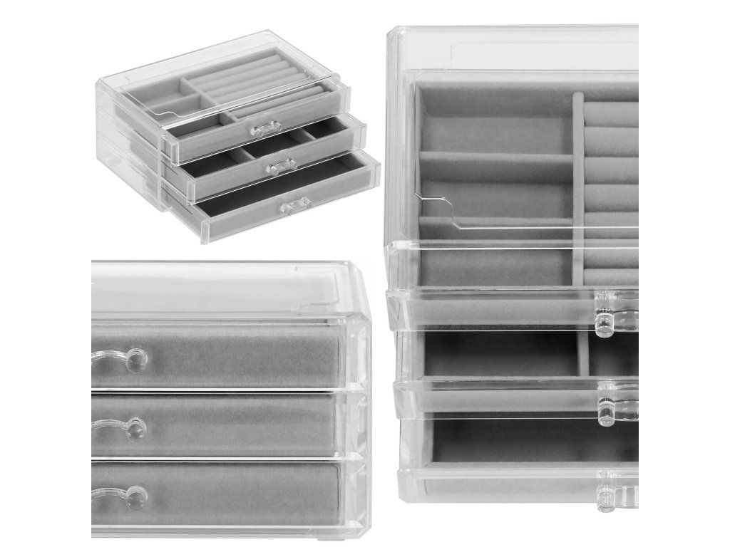 Primul sertar este împărțit în trei compartimente: lățime: 7,5 cm x adâncime: 3,5 cm și un compartiment mare pentru inele sau lănțișoare: lățime: 12 cm x adâncime: 12 cm