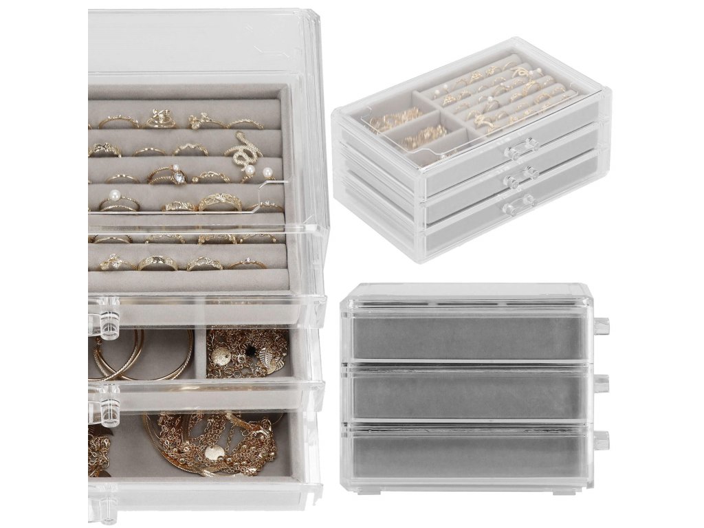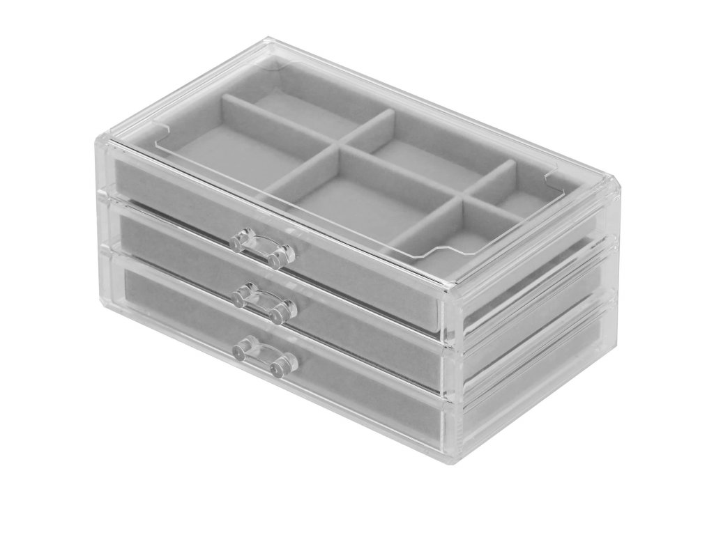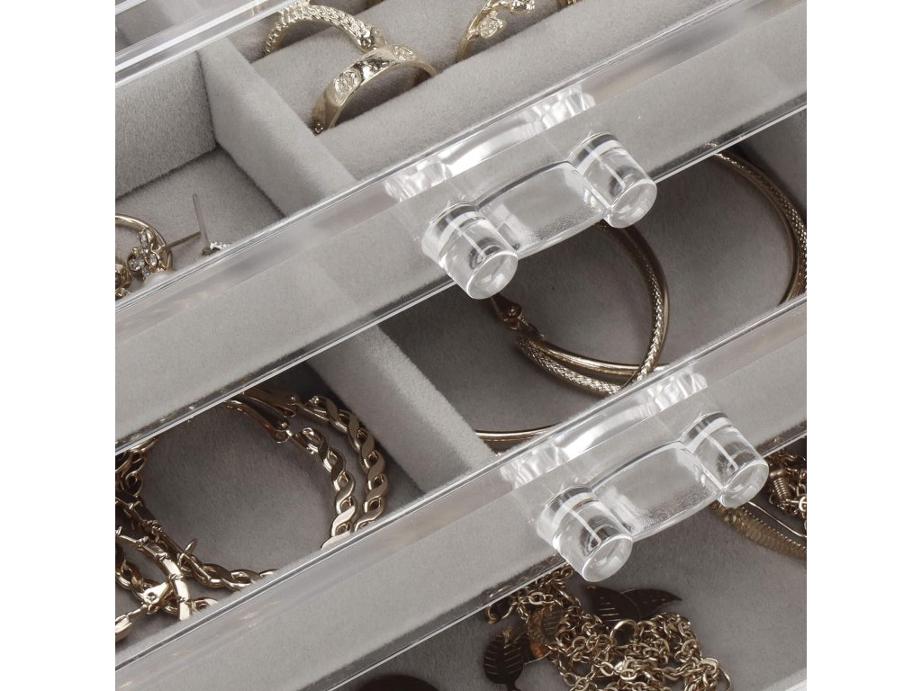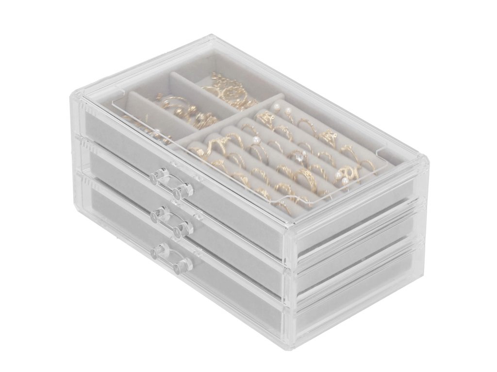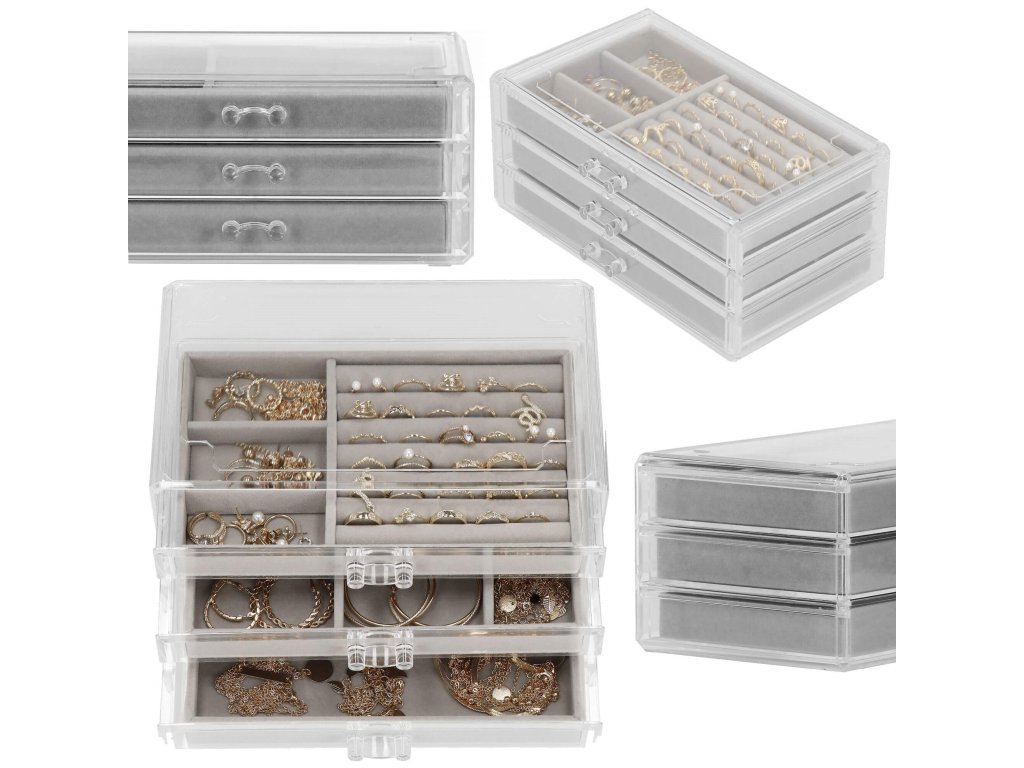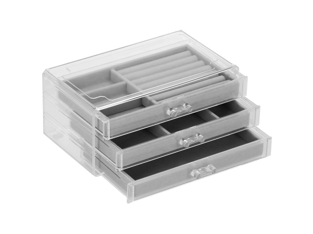 Primul sertar este împărțit în trei compartimente: lățime: 7,5 cm x adâncime: 3,5 cm și un compartiment mare pentru inele sau lănțișoare: lățime: 12 cm x adâncime: 12 cm