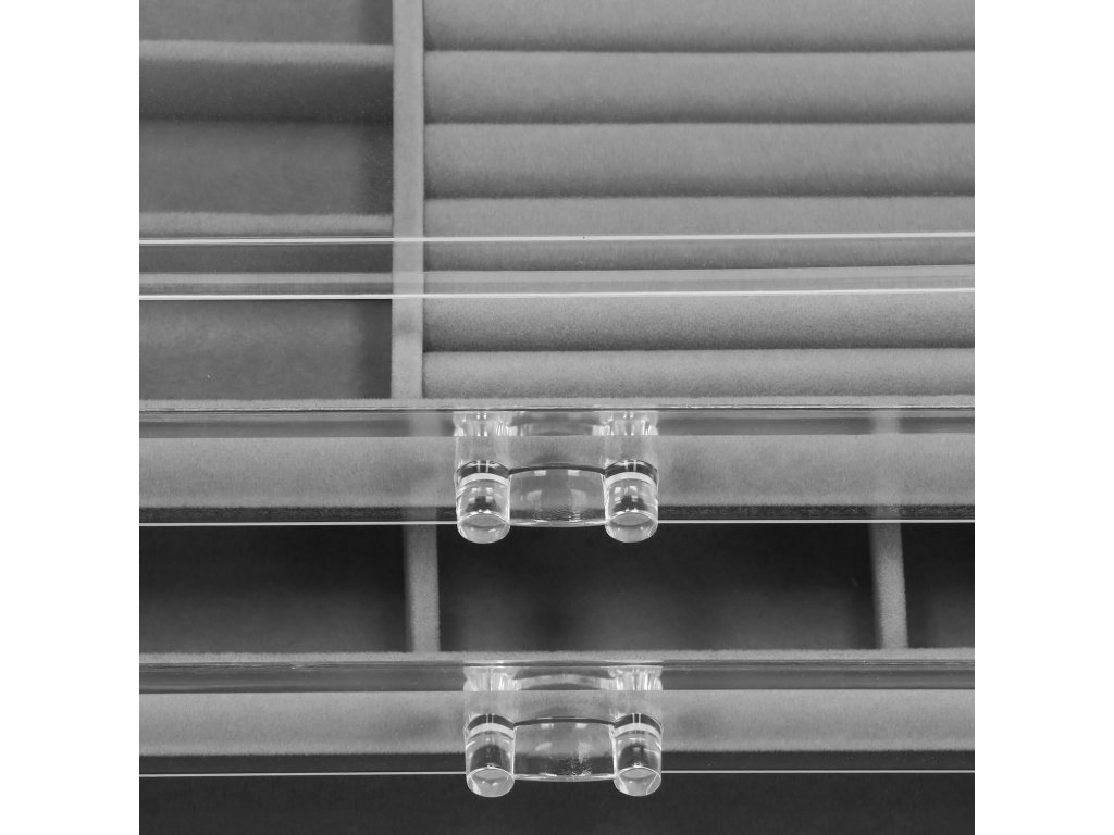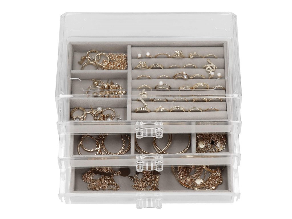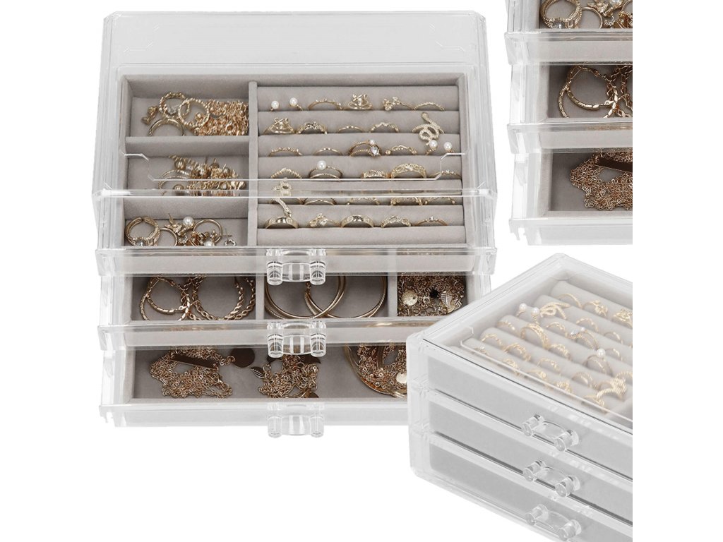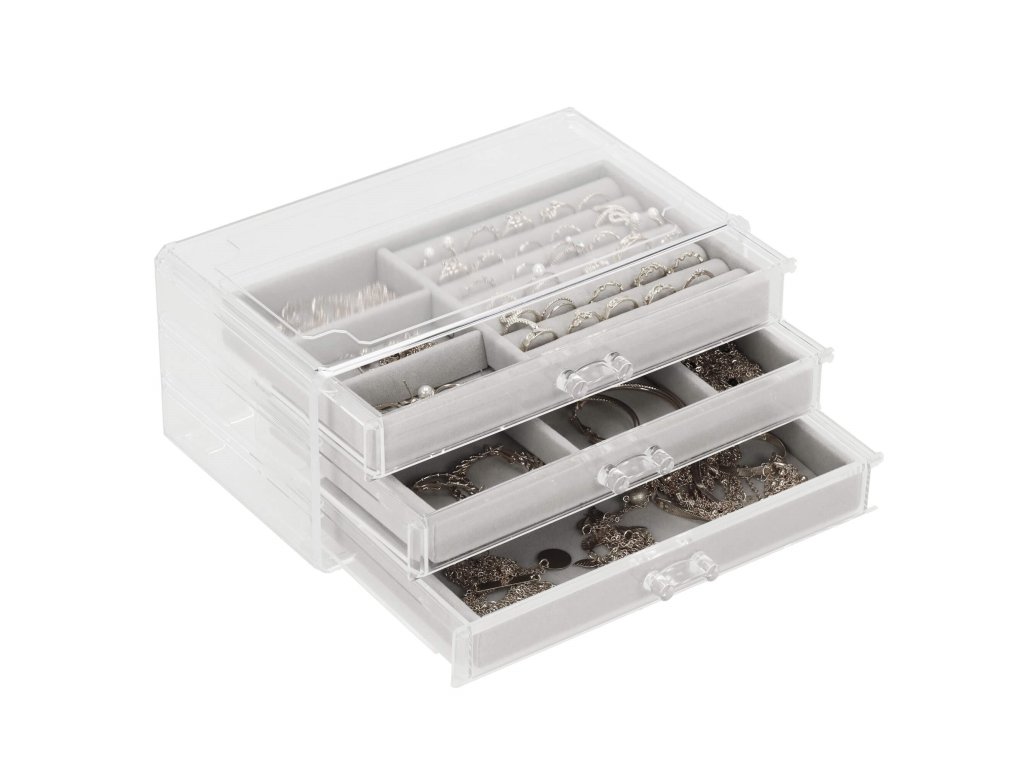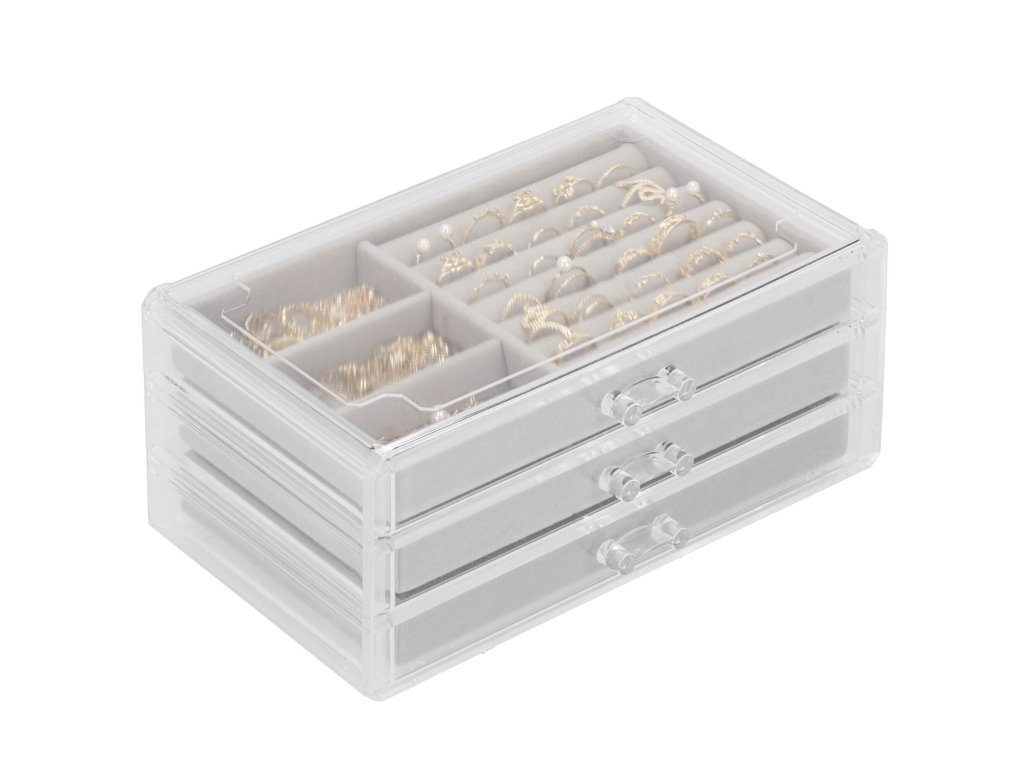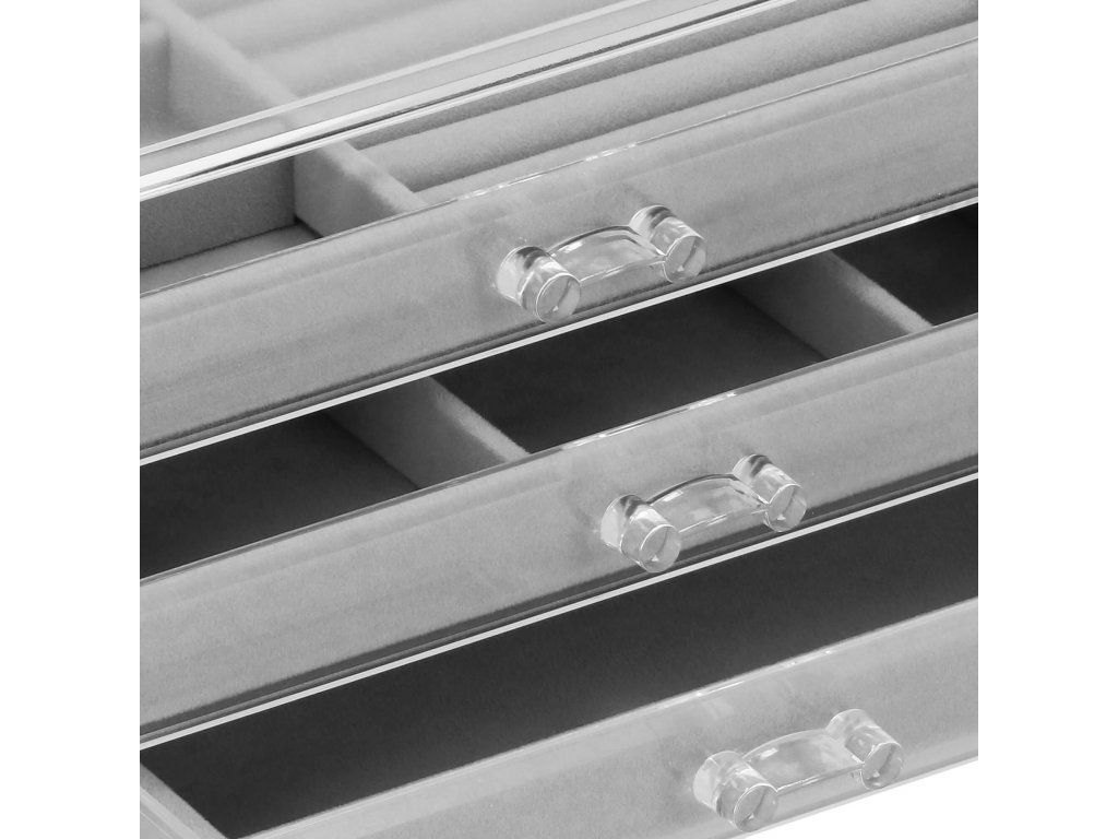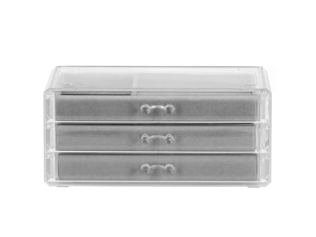 Primul sertar este împărțit în trei compartimente: lățime: 7,5 cm x adâncime: 3,5 cm și un compartiment mare pentru inele sau lănțișoare: lățime: 12 cm x adâncime: 12 cm