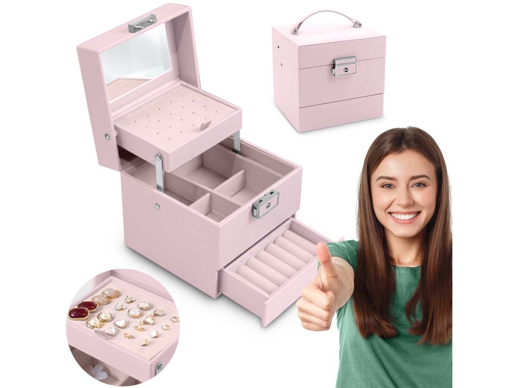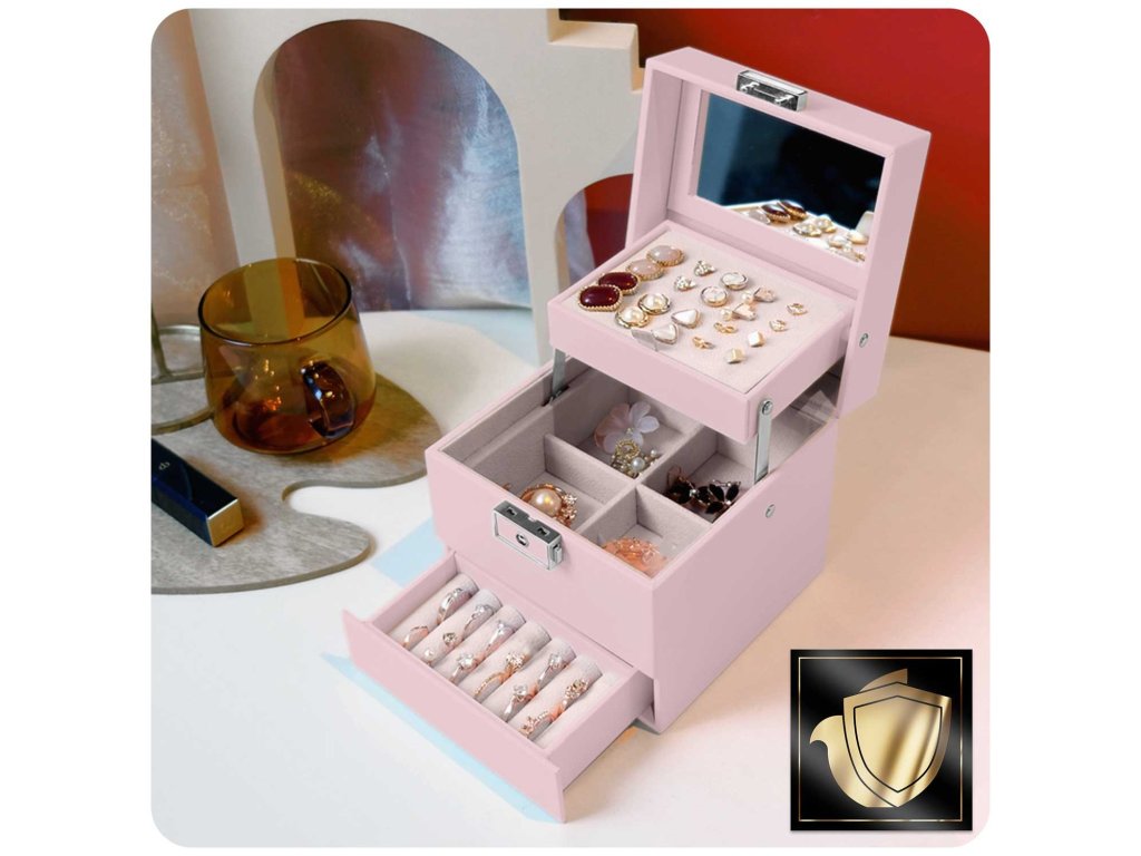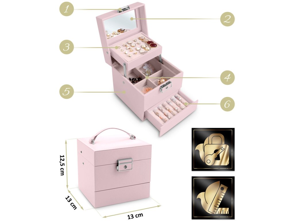 Stilul și calitatea prelucrării depășesc standardele unor astfel de produse disponibile pe piața poloneză. Cutia noastră de bijuterii va atrage o gamă largă de gusturi și va fi utilă pentru orice doamnă, indiferent de vârstă.