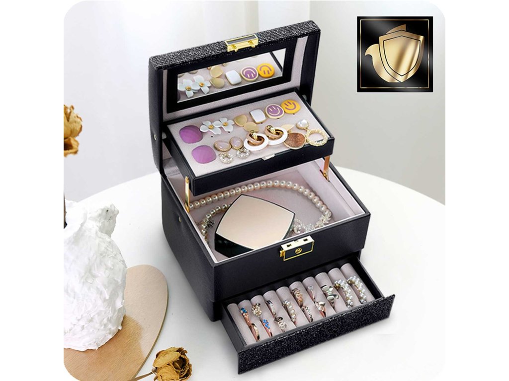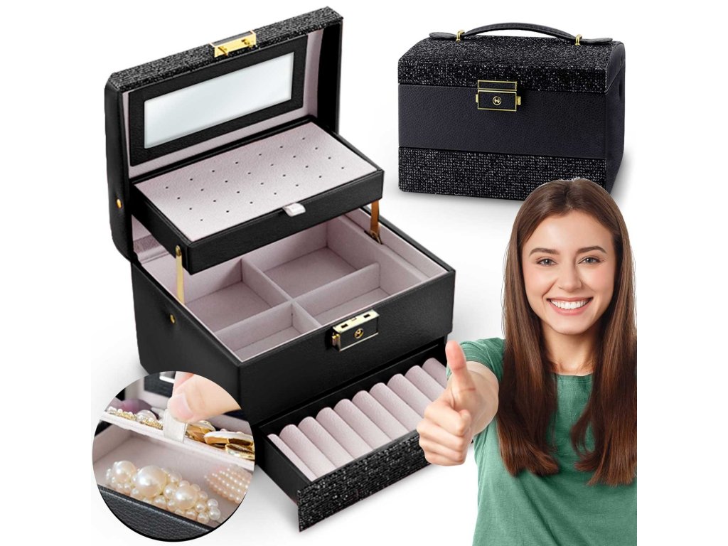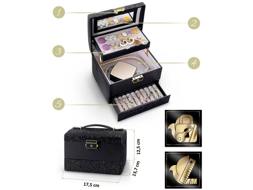 Această cutie îndeplinește visurile fetelor și nevoile femeilor. Este suficient de spațioasă pentru a deveni o comoară pentru primii comori ai unei fete și totodată la fel de elegantă pentru a depozita colecția de bijuterii a unei femei adulte.