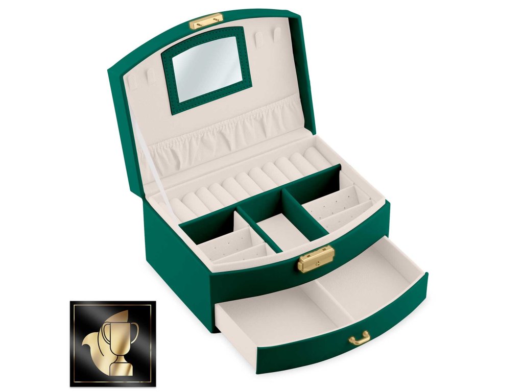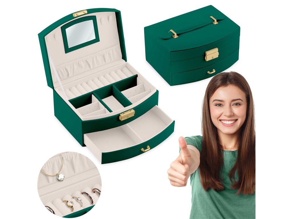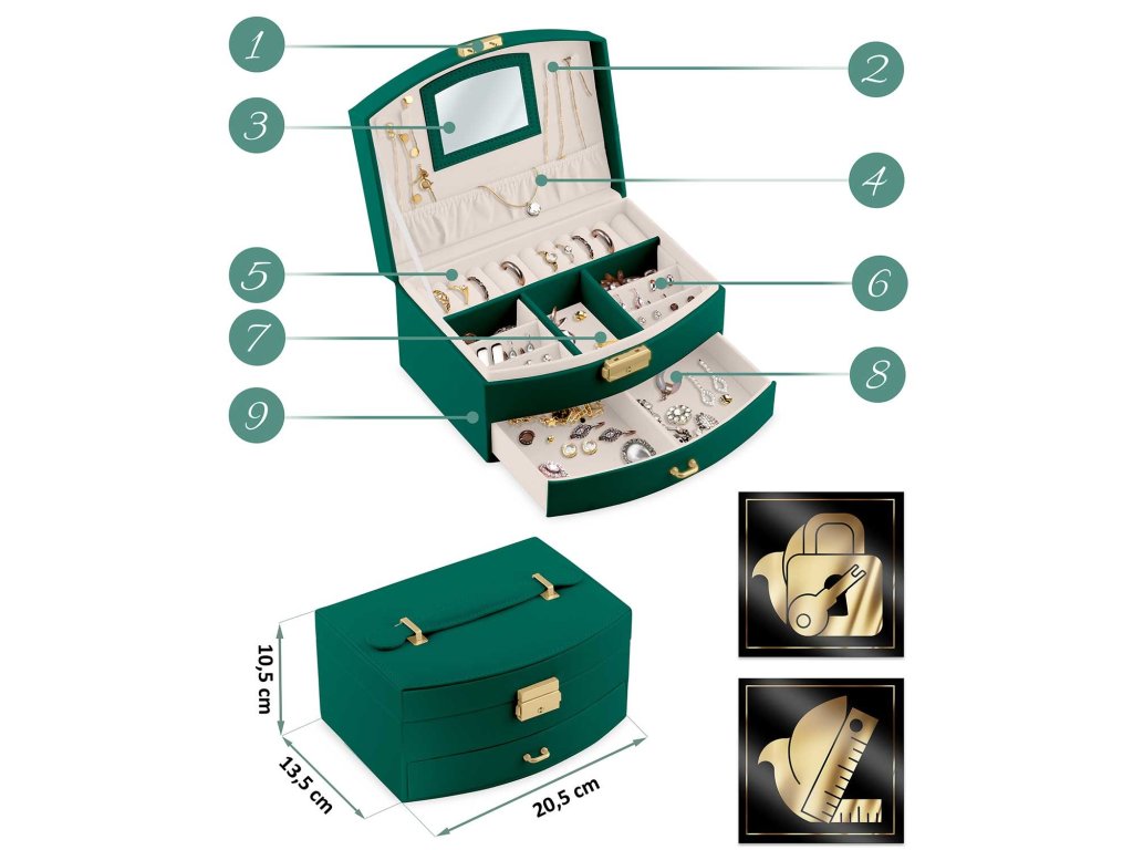Stilul și prelucrarea depășesc standardul acestor tipuri de produse disponibile pe piața poloneză. Cutia noastră de bijuterii se va potrivi unui spectru larg de gusturi și va fi utilă pentru fiecare doamnă fără a întreba vârsta acesteia.