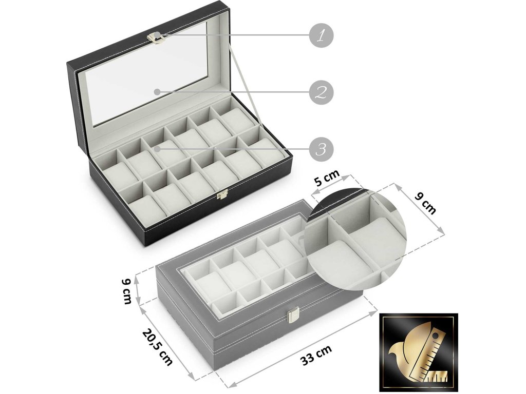 - 12 compartimente pentru organizarea ceasurilor (9 cm x 5 cm x 4,5 cm)