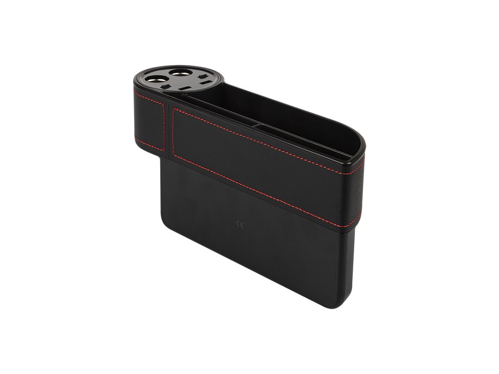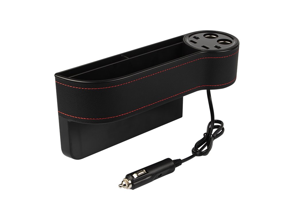 . Tapițeria deosebit de frumoasă de culoare neagră asigură că produsul se va potrivi în orice interior de vehicul, iar ața roșie subliniază un design unic și modern. În partea din față a cutiei de depozitare sunt amplasate două prize suplimentare pentru brichete de țigară cu întrerupătoare, două intrări USB și un afișaj LED clar care afișează informații despre tensiunea bateriei auto. Întregul dispozitiv este alimentat după conectarea la priza brichetei auto - pe ștecherul de conectare există un indicator de semnalizare care informează despre funcționarea corectă.Caracteristici principale: