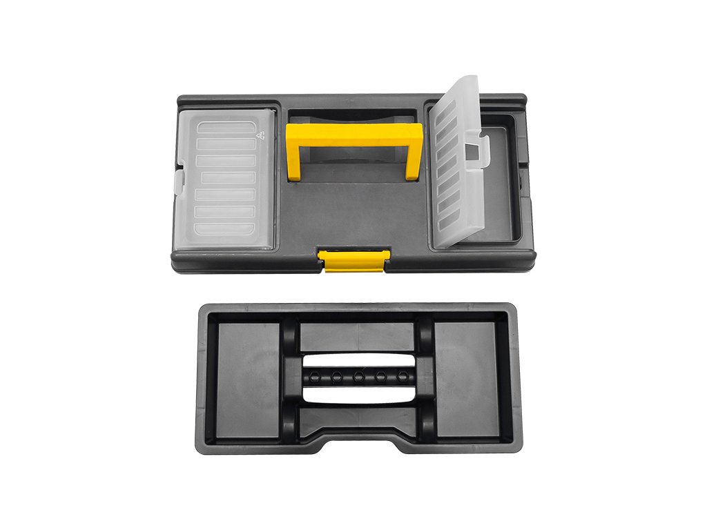 Cutie de unelte destinată pentru setul practic de scule. Echipată cu două organizatoare și un suport interior practic.