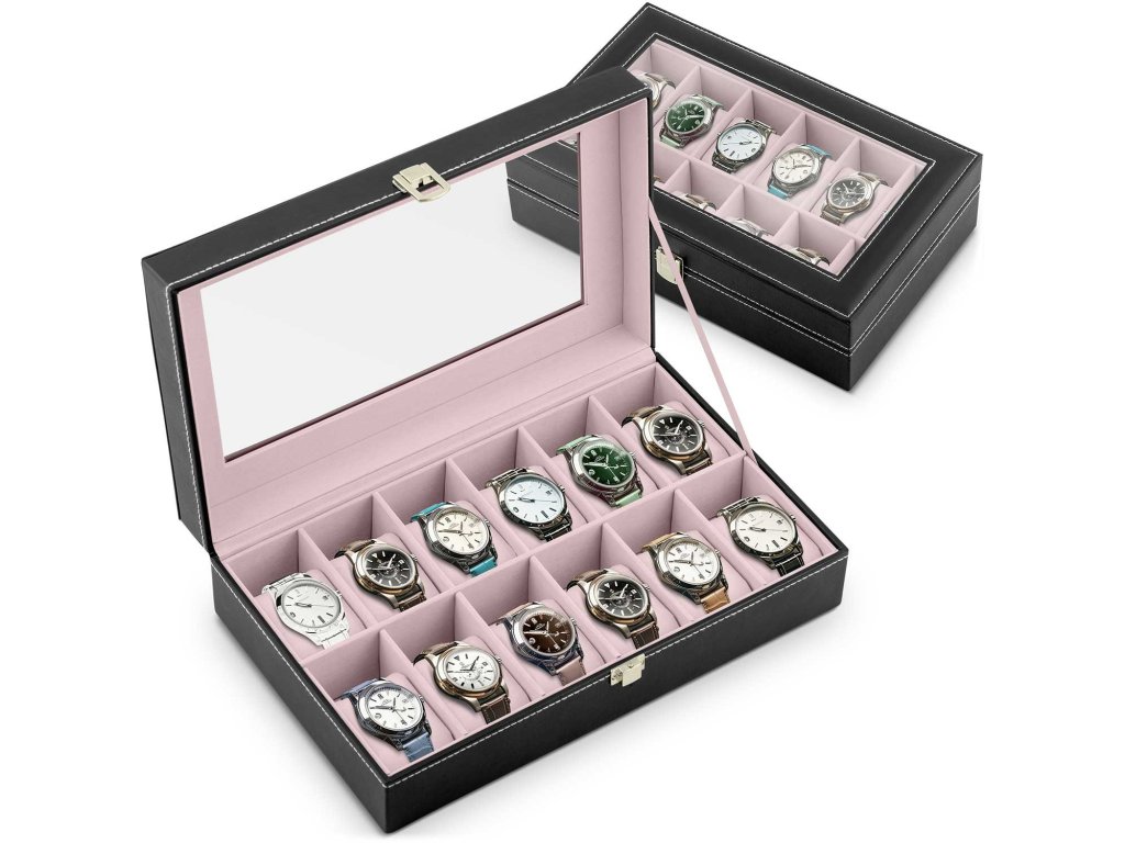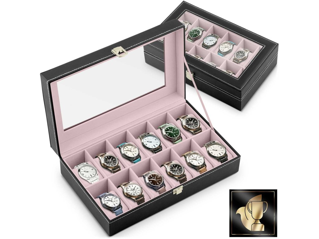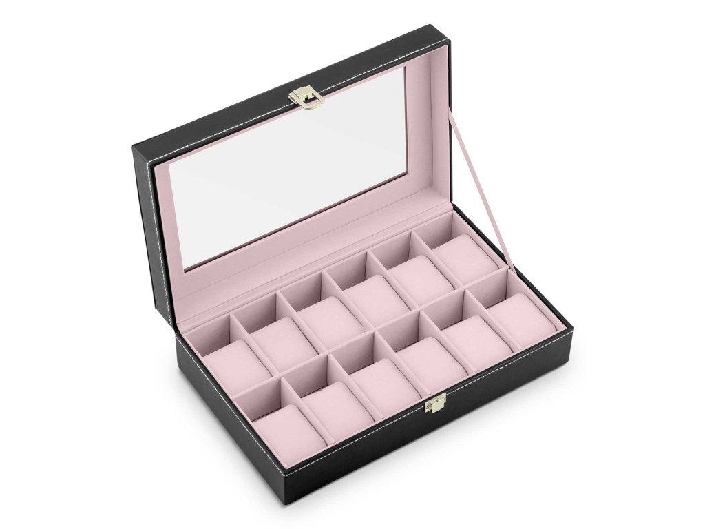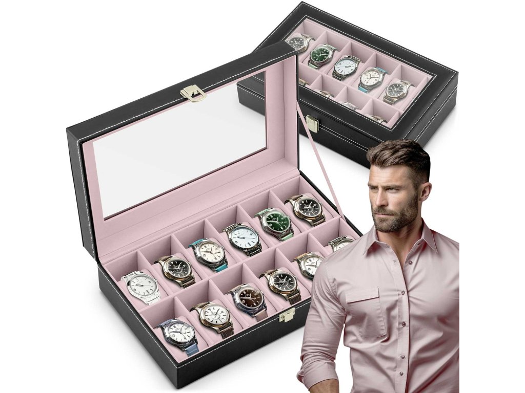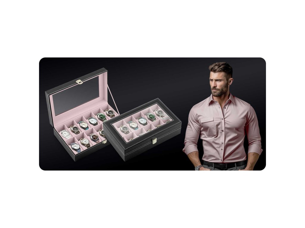 Cu posibilitatea de a stoca până la 12 ceasuri este cadoul ideal pentru orice bărbat și o necesitate pentru colecționari. Produsul oferă un spațiu dedicat separat pentru fiecare ceas, prevenind astfel posibilele zgârieturi care ar putea apărea când ceasurile sunt depozitate împreună. Compartimentele acoperite cu material moale pot fi folosite și pentru a depozita orice alt tip de bijuterii.