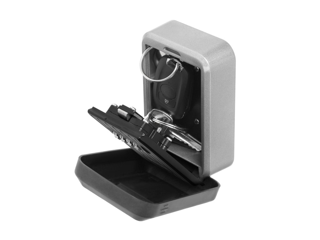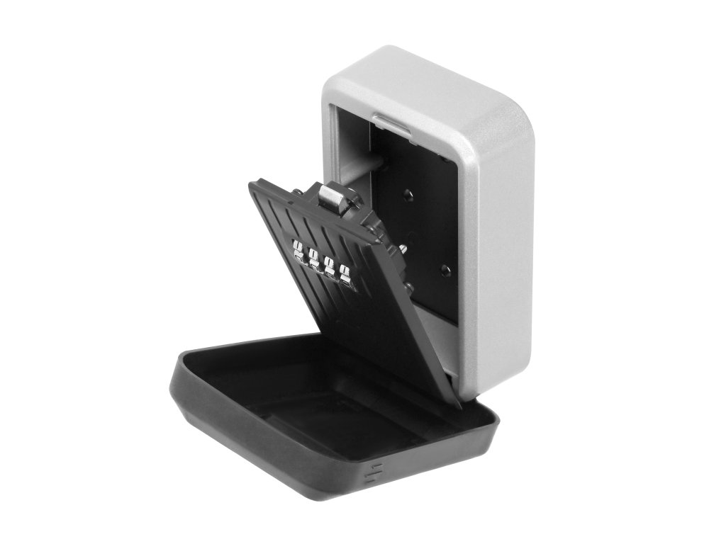 Seif compact pentru chei, potrivit pentru montarea pe perete atât la interior, cât și la exterior. Acest seif este o soluție excelentă atunci când doriți să depozitați cheile într-un loc sigur. Lacătul cu patru cifre oferă 10.000 de combinații posibile de cod, iar mecanismul folosit împiedică încercările de a forța panoul frontal. Materialele utilizate, în special capacul de cauciuc, garantează că produsul este rezistent la condițiile meteorologice pe termen lung. Șuruburile de montaj sunt incluse în livrare.Specificație tehnică