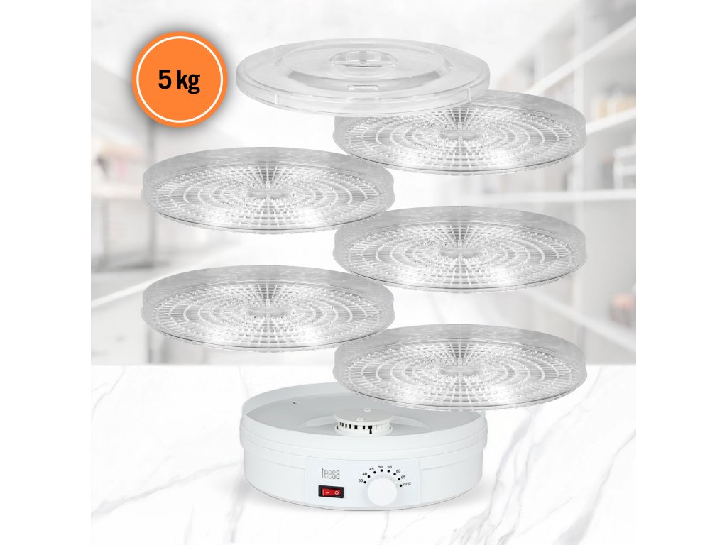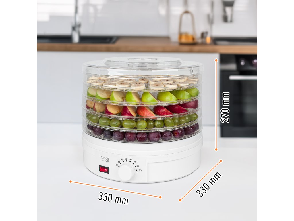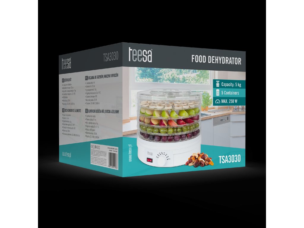 Uscătorul TSA3030 este echipat cu cinci site cu diametrul de 32 cm, care vă permit să uscați până la 5 kg de alimente. Acum vă puteți bucura de o doză de vitamine naturale indiferent de anotimp sau vă puteți surprinde prietenii cu o gustare sănătoasă la întâlniri. Număr de site: 5
