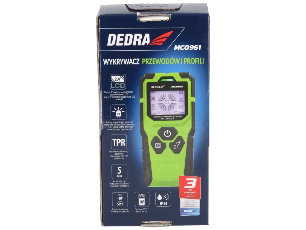 Detector de cabluri și conductori DEDRA MC0961 permite detectarea componentelor metalice și conductelor, cablurilor electrice de curent alternativ și altor curenți, cât și a lemnului. Acest lucru ajută la completarea documentației tehnice a clădirilor. Ecranul LED iluminat, ușor de citit, permite o interpretare simplă a elementelor detectate, în timp ce indicatorul (în trei culori: verde, galben și roșu) semnalează găsirea unui element. În plus, detectorul extern este echipat cu un semnal sonor, astfel încât să nu pierzi avertizarea. Dispozitivul include o carcasă, o clemă pentru brâu, o baterie de 9V și un manual de utilizare.