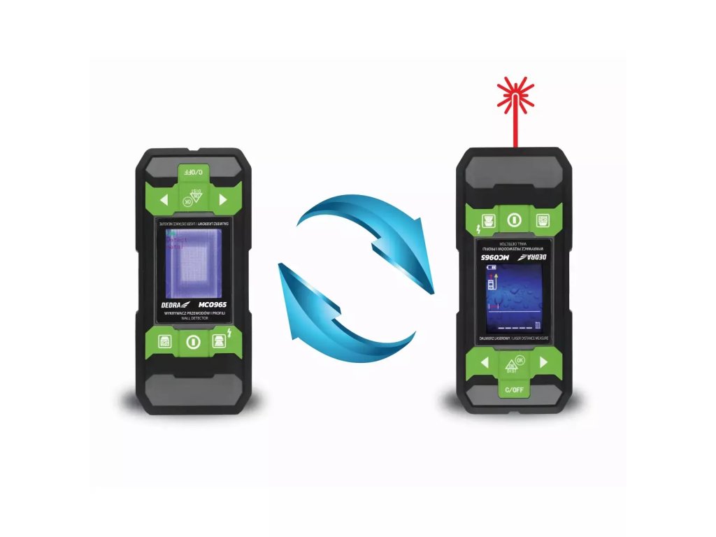 Detectorul de fiare și cabluri DEDRA MC0965 permite detectarea componentelor metalice și firelor, cablurilor electrice fără și sub tensiune alternativă și a lemnului, precum și a altor obiecte precum fierul, betonul, sticla, aluminiul, etc. Acest lucru ajută la completarea documentației tehnice a clădirilor. În plus, detectorul este echipat cu funcția de măsurare a distanței cu un interval de lucru de 0,05-40 m, ceea ce reprezintă un mare avantaj, deoarece avem un singur dispozitiv în loc de două.