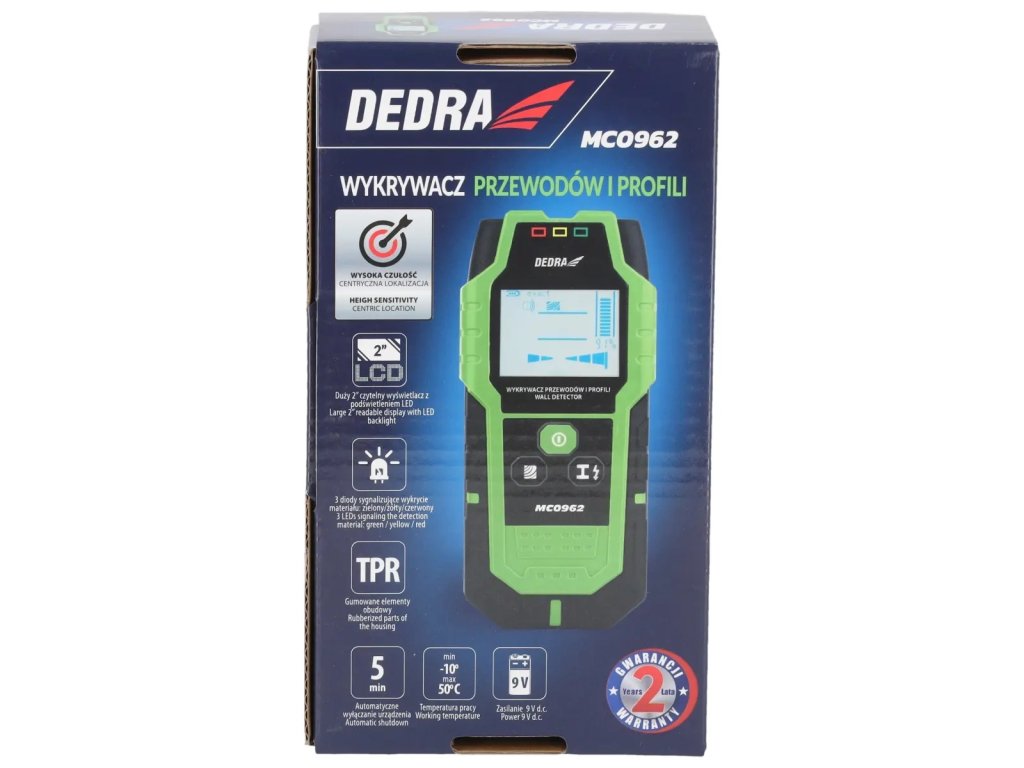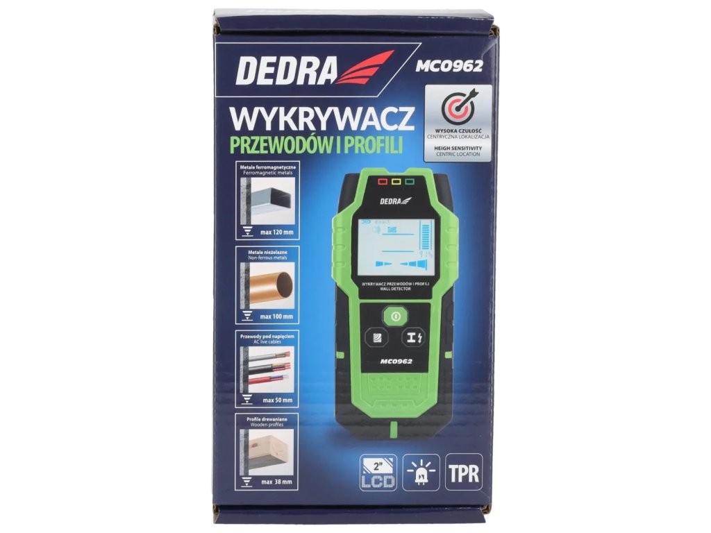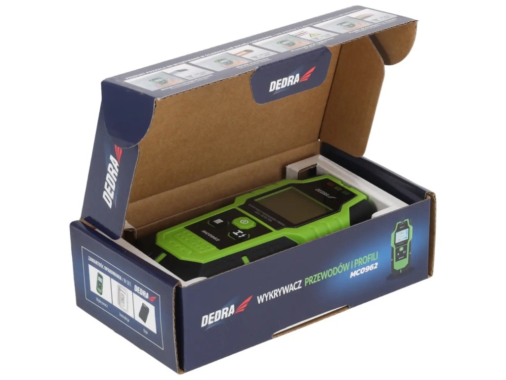 Cu detectorul de cabluri și profile DEDRA MC0962, puteți detecta componente metalice și profile, curent alternativ și non-electric, precum și lemn. Acest lucru ajută la completarea documentației tehnice a clădirilor. Senzorul de mare sensibilitate și display-ul clar permit localizarea mai precisă a obiectului dorit, minimizând riscul de a tăia conductorii sau cablurile electrice. Detectorul de cabluri dispune, de asemenea, de un semnal sonor, astfel încât să nu vă scape niciun avertisment. Detectorul este livrat împreună cu un caz, un clips pentru curea și un ghid de utilizare.
