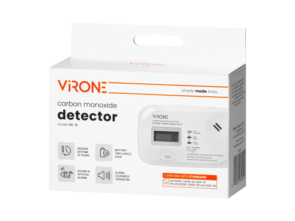 Detectorul de fum pe bază de baterii este un dispozitiv de alarmă modern conceput pentru a monitoriza continuu concentrația de monoxid de carbon. Adaptat pentru utilizare în interior, în spații deosebit de vulnerabile la pericole care pot apărea ca urmare a unei defecțiuni sau a lipsei de ventilație adecvată.Unitatea are un afișaj LCD care indică nivelul de pericol detectat (monoxid de carbon), starea de descărcare a bateriei și sfârșitul duratei de viață. Are un senzor electrochimic încorporat care arată foarte precis nivelurile de monoxid de carbon. Afișajul ajută, de asemenea, la citirea informațiilor despre nivelurile de umiditate și temperatură, fără a fi nevoie să utilizați echipamente suplimentare.