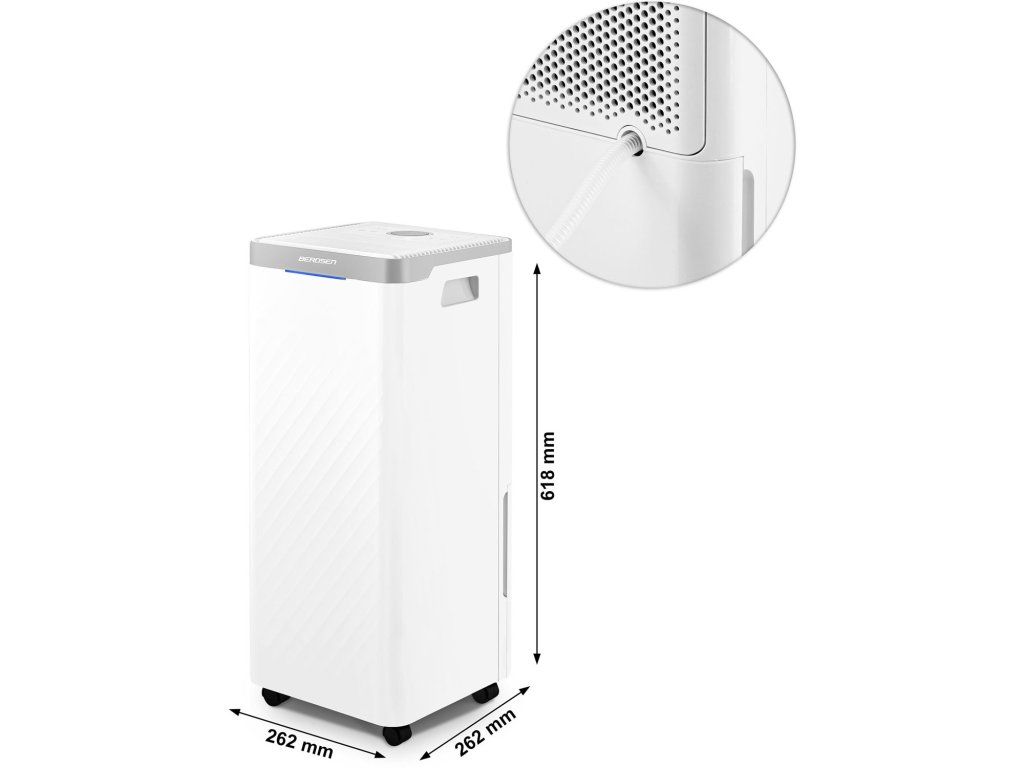 #20.000 ml/zi#. Dezumidificatorul BD-522 funcționează pe principiul condensării, eficient condensând umiditatea din aer. Astfel, neutralizează intensitatea fungilor, mucegaiului și mirosurilor neplăcute din cameră și în același timp îți crește confortul.