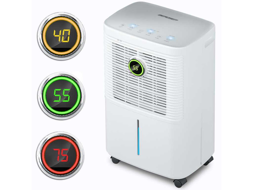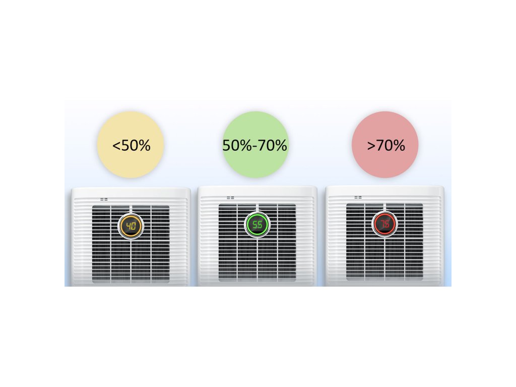 Afișajul frontal vă informează, prin culoare, despre nivelul de umiditate din cameră:- Lumină galbenă: umiditate <50% RH