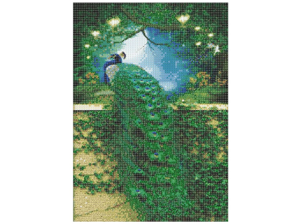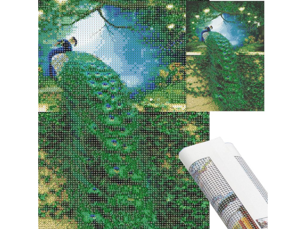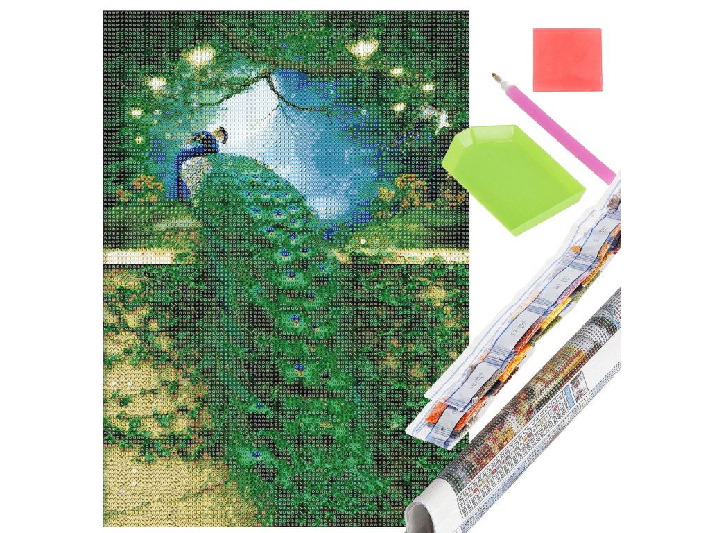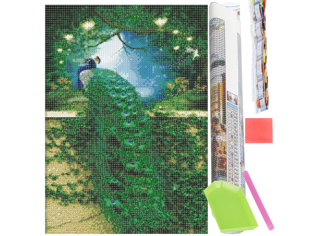 - 1x pânză solidă cu imagine tipărită, care arată imaginea unui păun cu index care asociază literele cu culorile și culorile cu numerele determinând culoarea diamantului