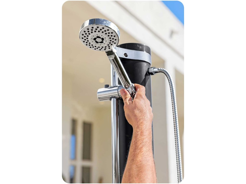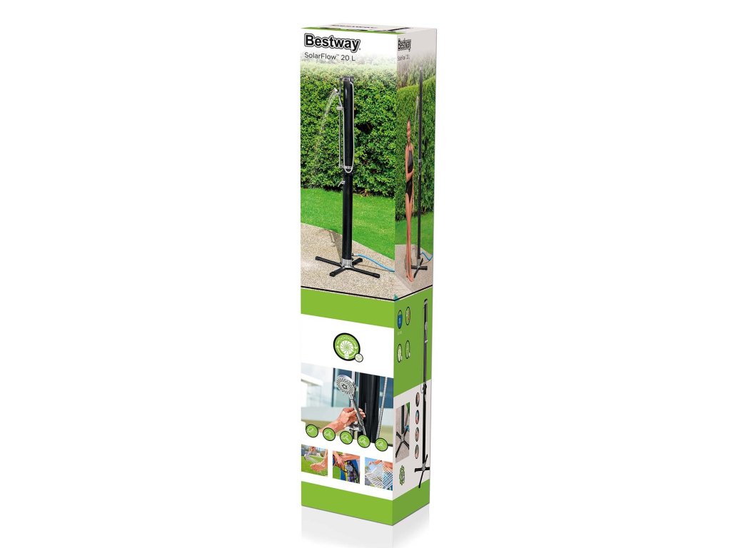 În plus, rezervorul de apă poate conține până la 20 de litri de apă, care datorită culorii și construcției dușului pot fi încălzite de razele solare.