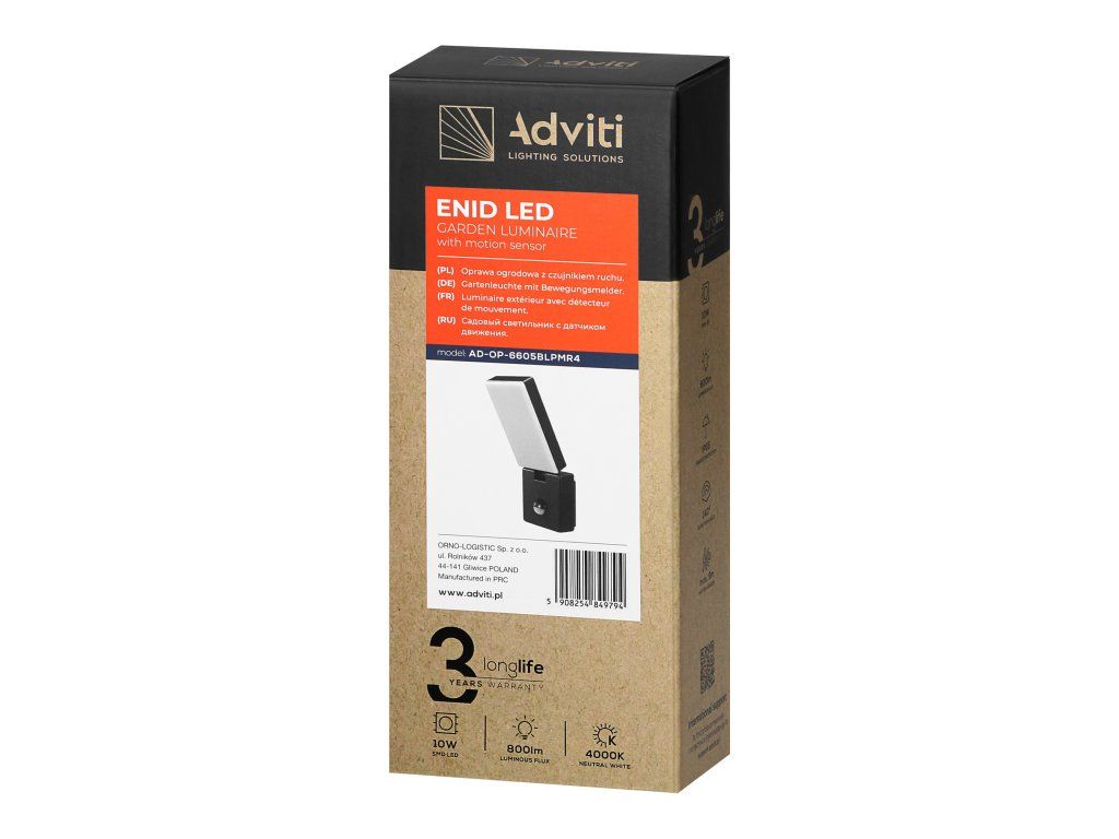 ENID LED este un corp de iluminat de grădină cu un senzor de mișcare PIR, care este perfect ca iluminat exterior pentru fațadele clădirilor, proprietăți, grădini, terase sau garaje. Senzorul de mișcare integrat aprinde lumina doar atunci când este necesar, crescând eficiența energetică.Un flux luminos de 800lm la 10W oferă o iluminare eficientă. Temperatura de culoare de 4000K emite o lumină albă neutră, ideală pentru evidențierea spațiului exterior. Lampa este echipată cu un abajur mobil care permite reglarea precisă a direcției luminii orizontal (225° spre stânga, 45° spre dreapta) și vertical (60°). Fasciculul de lumină foarte larg permite o iluminare uniformă a împrejurimilor.