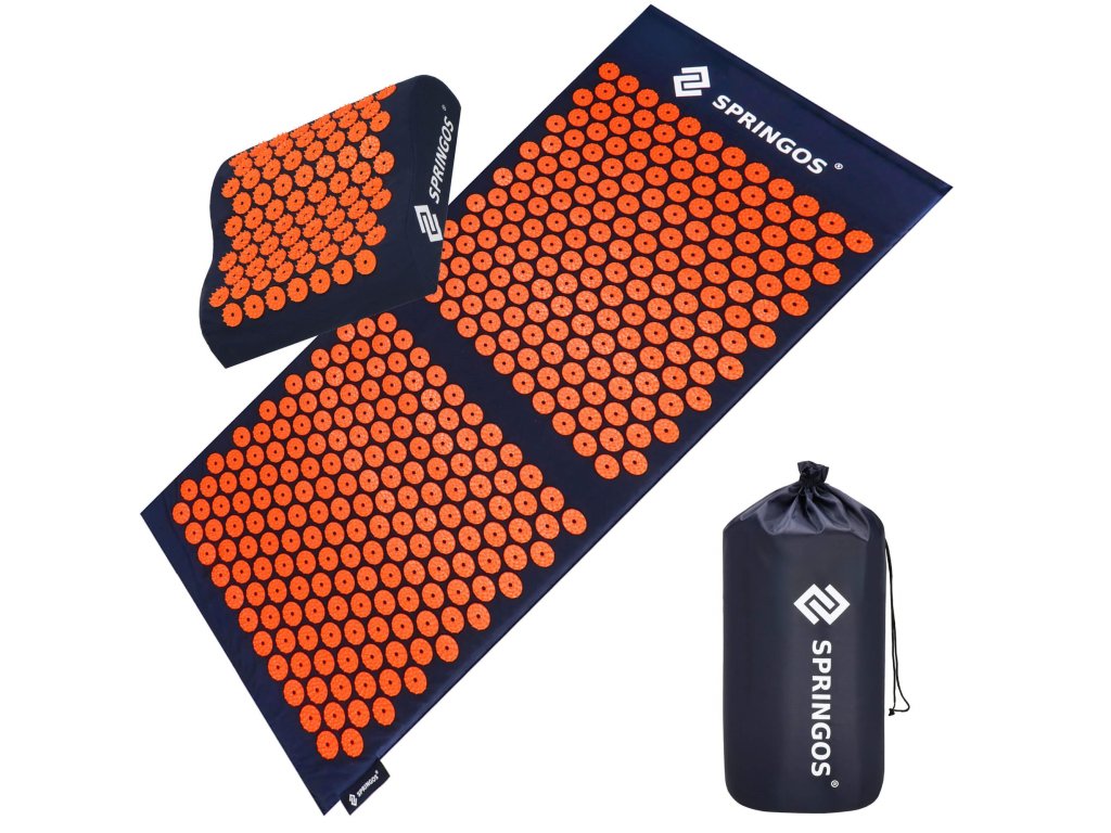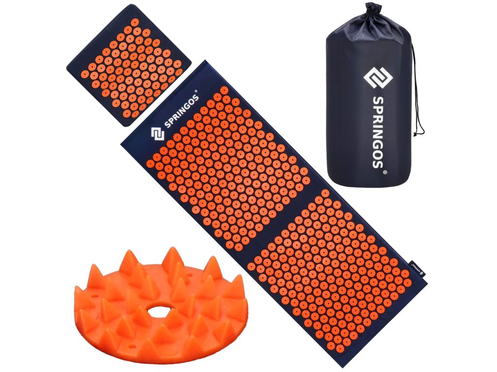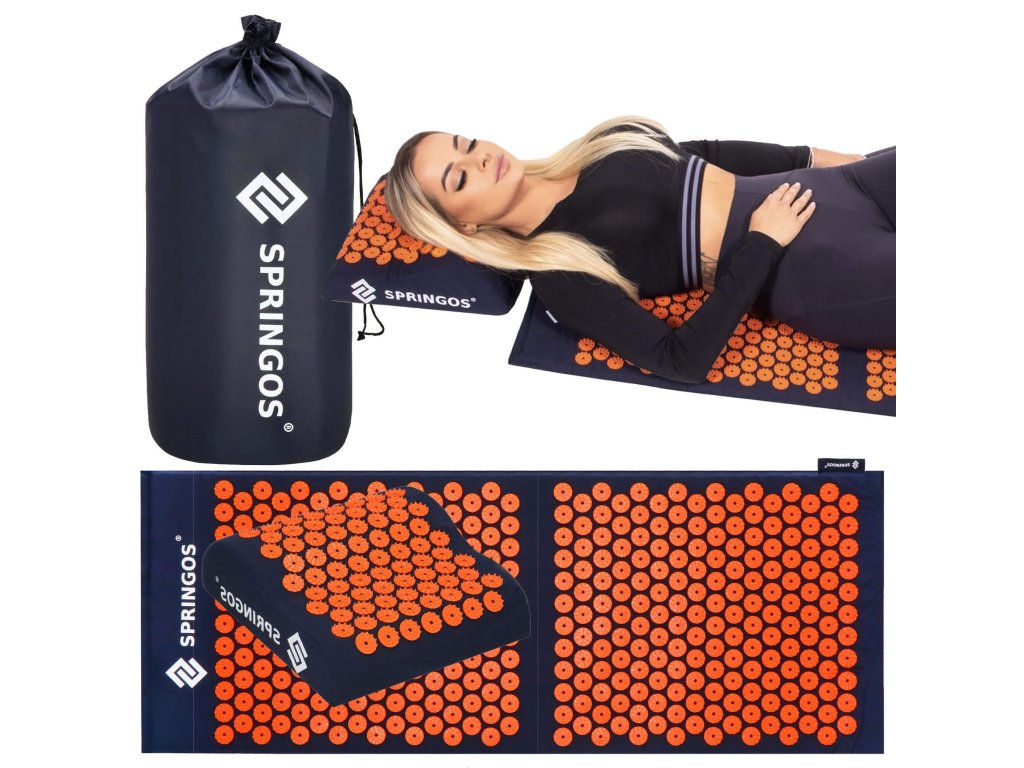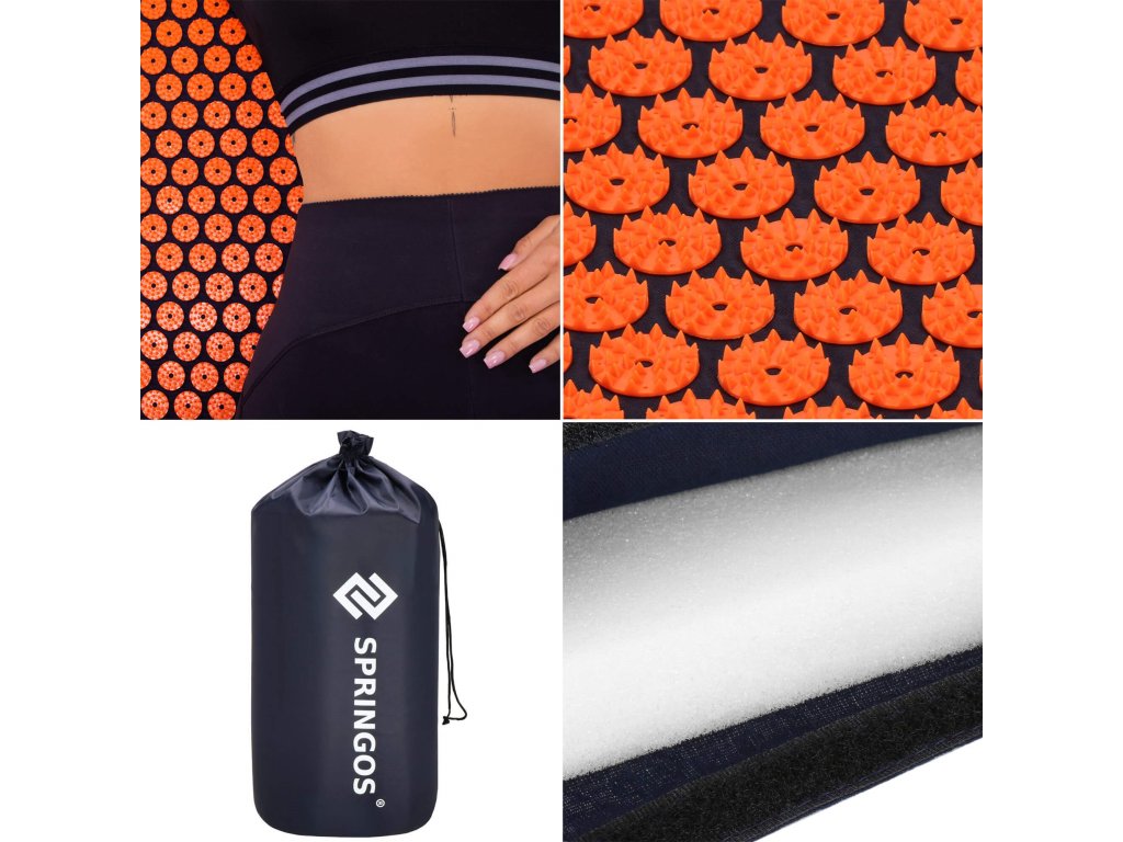 - Husele de bumbac pentru saltea și pernă sunt realizate din material de culoare albastru închis, discuri cu spini cusute de culoare portocalie. Husele au imprimat logo-ul alb Springos, + pe saltea un etichetă laterală cusută cu logo.