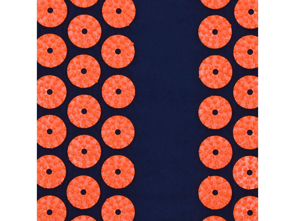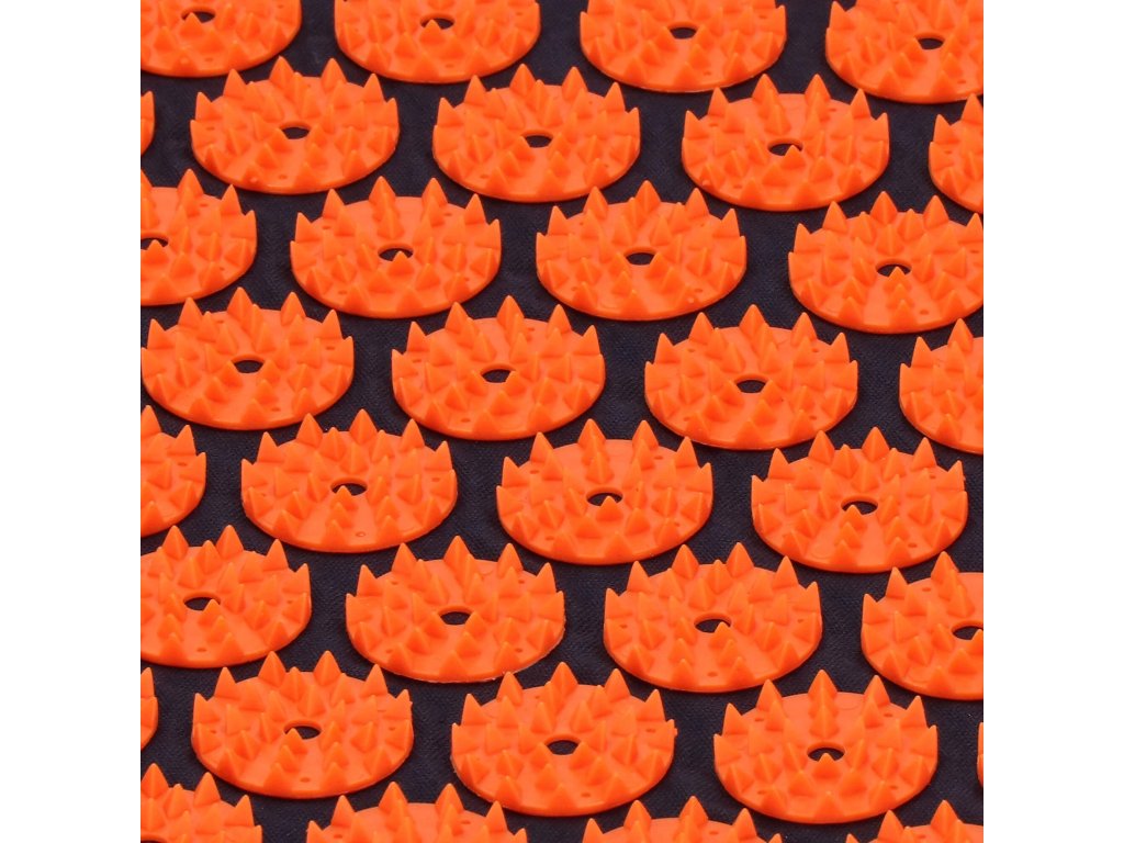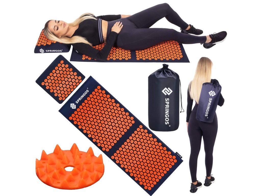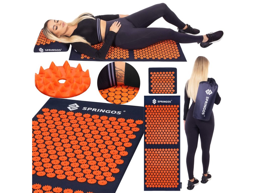 - Husele de bumbac pentru saltea și pernă sunt realizate din material de culoare albastru închis, discuri cu spini cusute de culoare portocalie. Husele au imprimat logo-ul alb Springos, + pe saltea un etichetă laterală cusută cu logo.