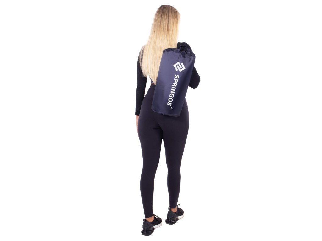 - Husa este prevăzută cu mâner și se închide cu o șnur cu capăt pentru șnur, imprimat cu logo Springos.