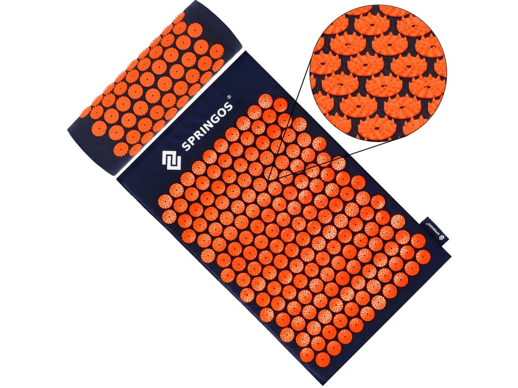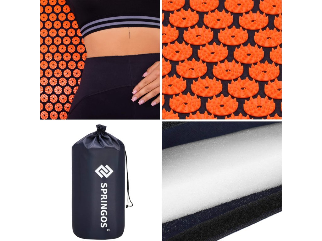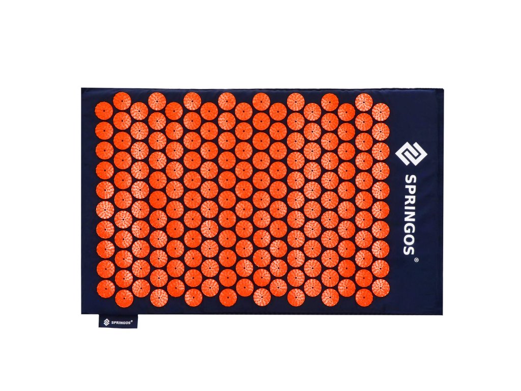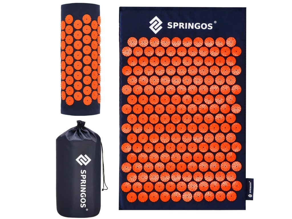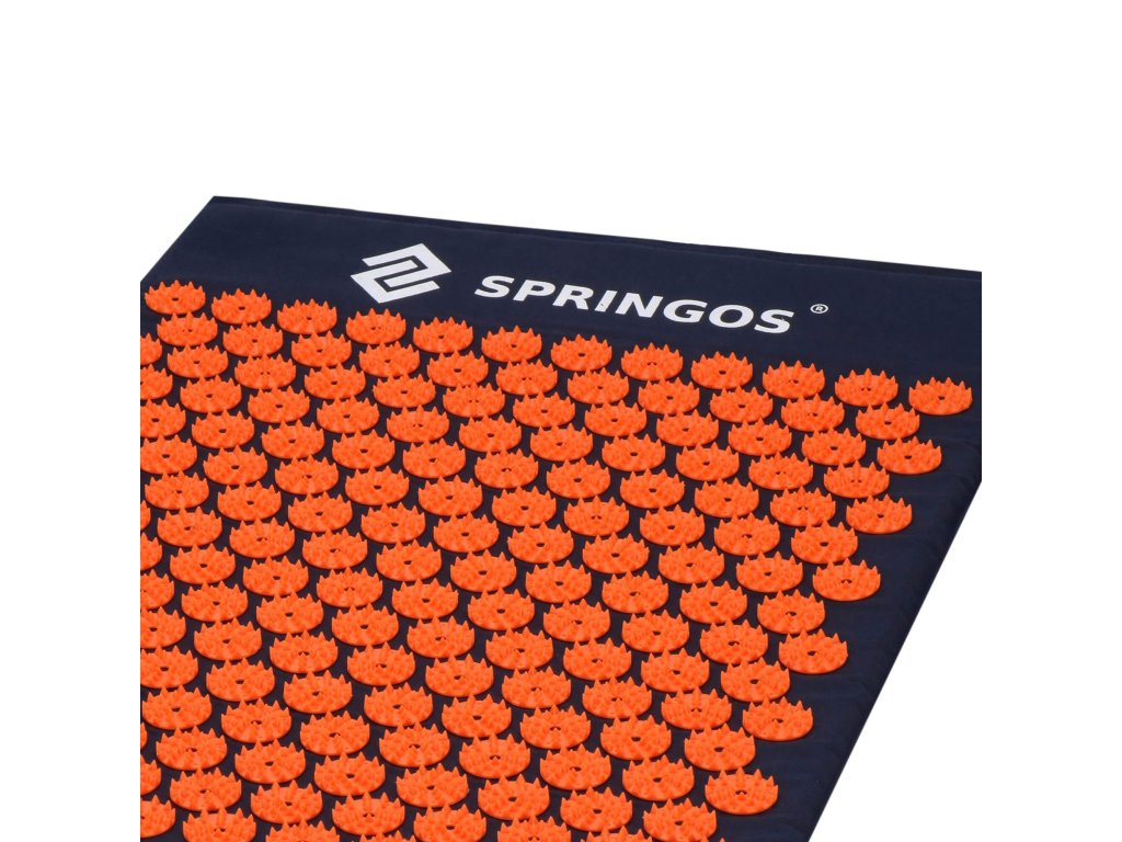 - Husele de bumbac ale saltelei și pernei sunt realizate dintr-un material de culoare albastru închis, cu discuri cusute cu țepi de culoare portocalie. Pe huse este imprimat logo-ul alb Springos, + pe saltea este cusută o etichetă laterală cu logo.