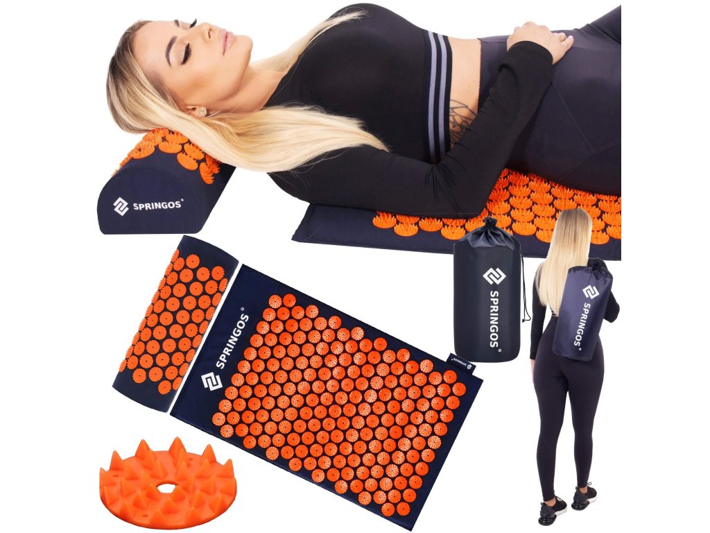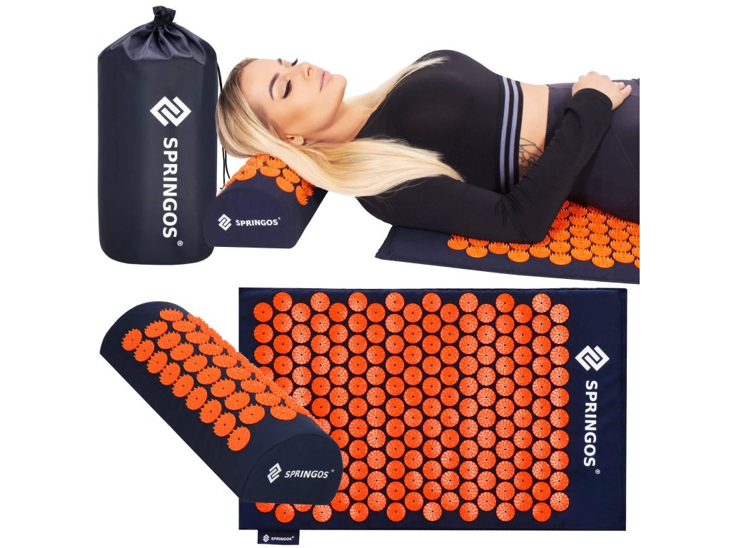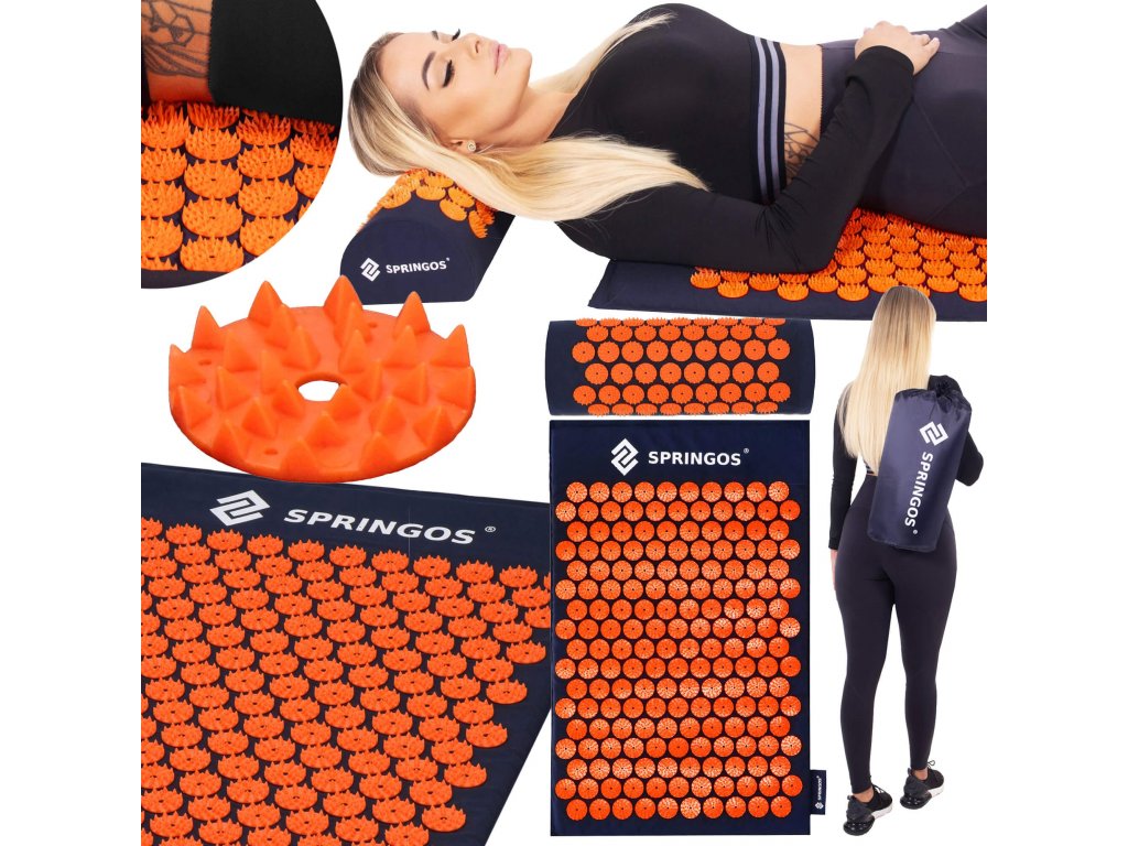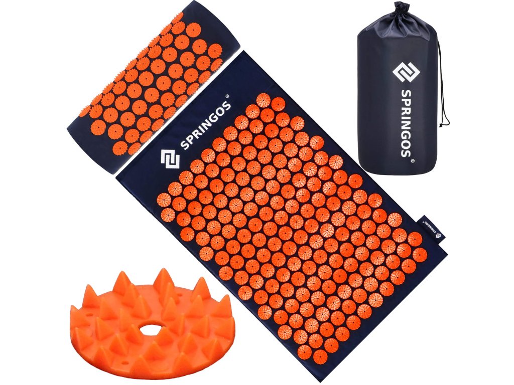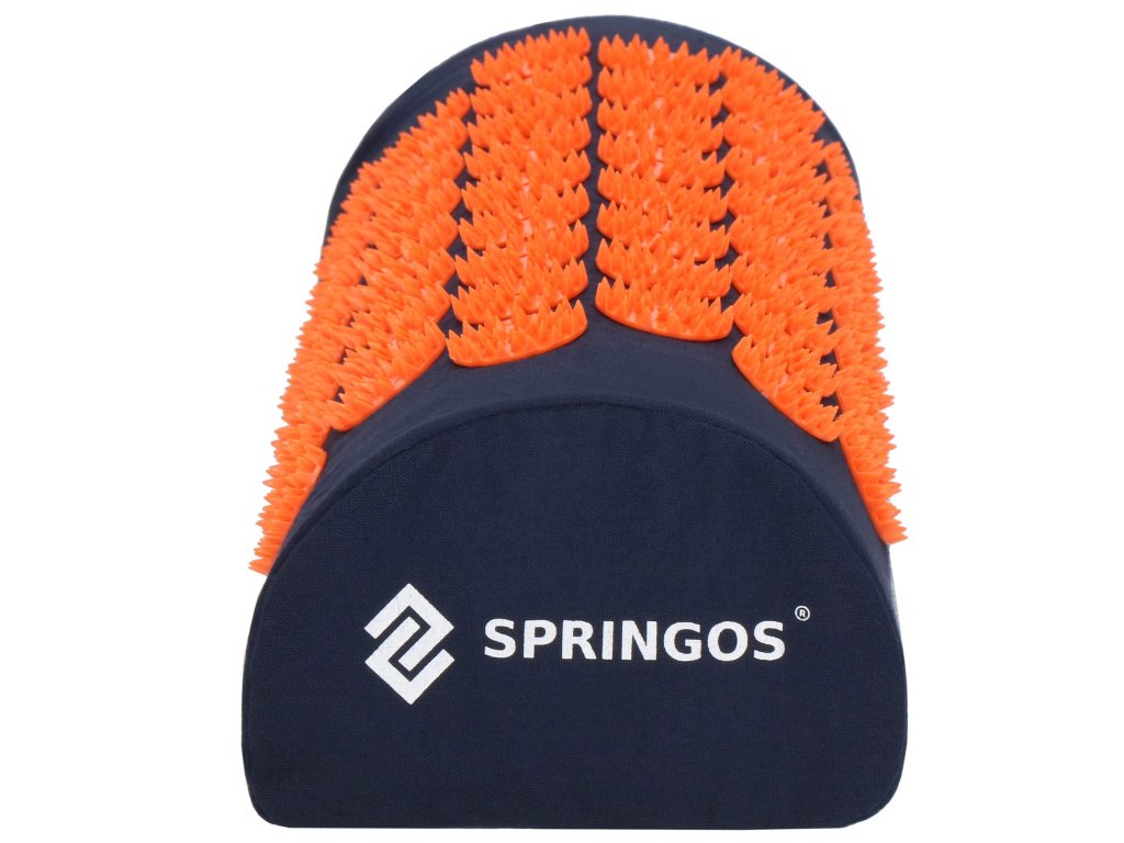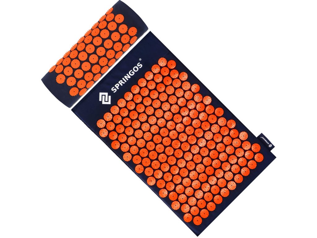 - Husele de bumbac ale saltelei și pernei sunt realizate dintr-un material de culoare albastru închis, cu discuri cusute cu țepi de culoare portocalie. Pe huse este imprimat logo-ul alb Springos, + pe saltea este cusută o etichetă laterală cu logo.