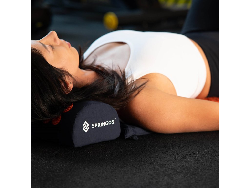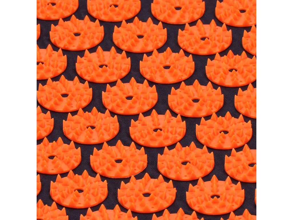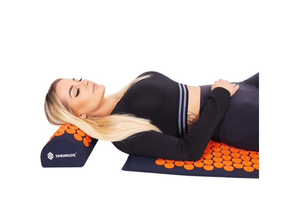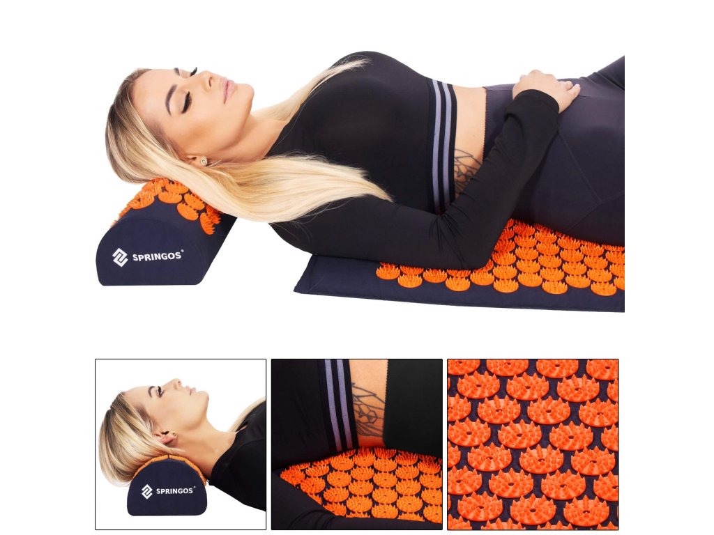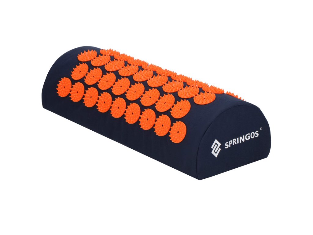 - Husele de bumbac ale saltelei și pernei sunt realizate dintr-un material de culoare albastru închis, cu discuri cusute cu țepi de culoare portocalie. Pe huse este imprimat logo-ul alb Springos, + pe saltea este cusută o etichetă laterală cu logo.