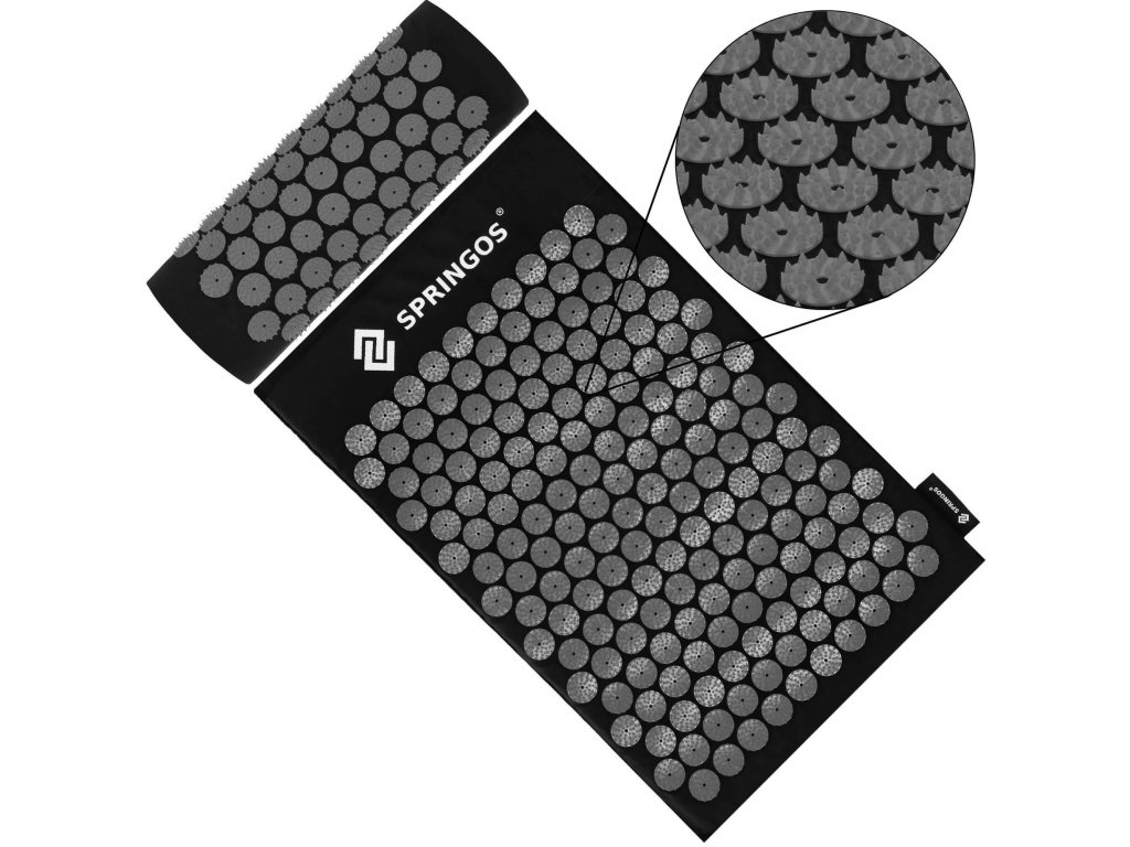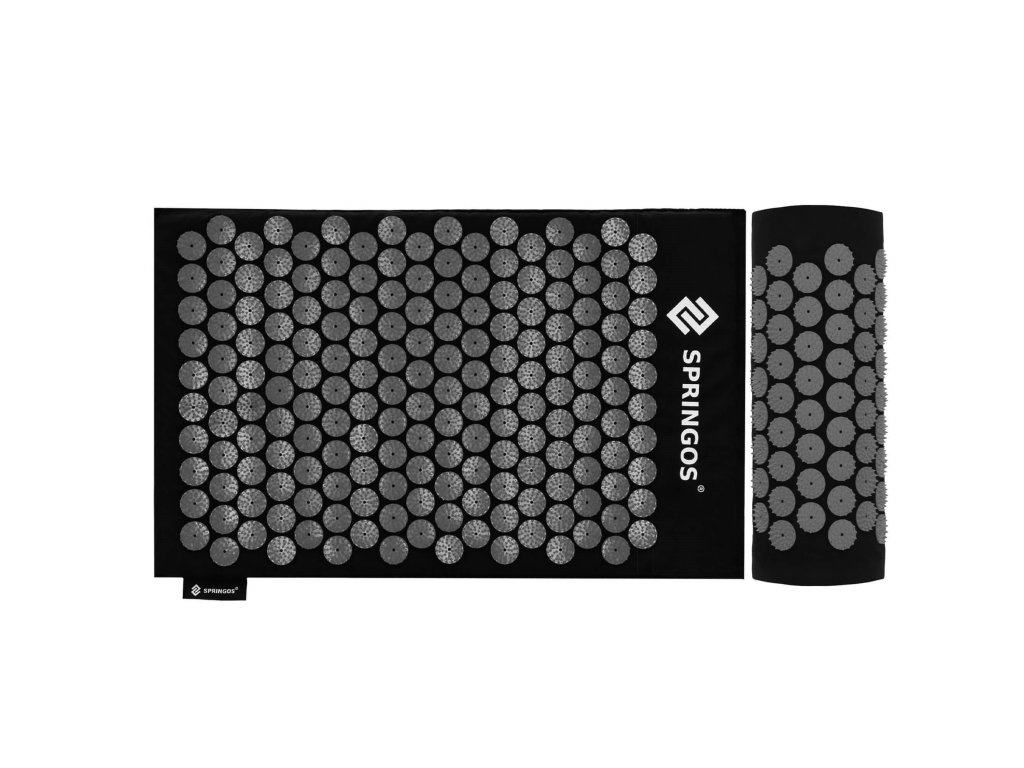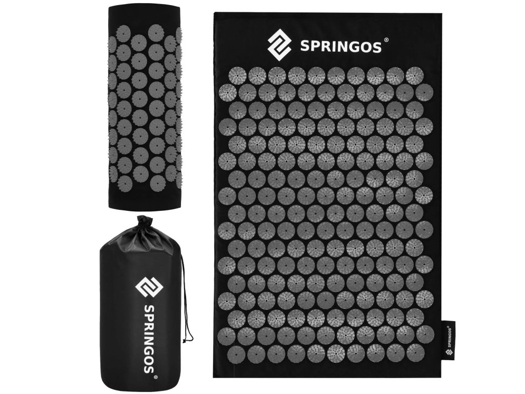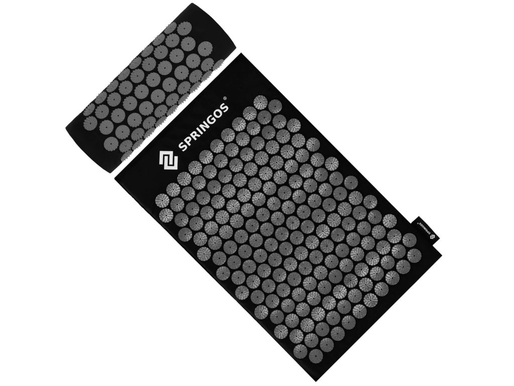- Capacele din bumbac ale saltelei și pernei sunt fabricate din material de culoare neagră, discuri cu vârfuri cusute de culoare neagră. Pe capace este imprimat logo-ul alb Springos, + pe saltea este aplicată o etichetă laterală cu logo.