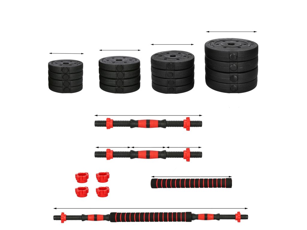- 2x bară scurtă - lungime totală: 50,5 cm / diametru pentru greutate: 2 cm / parte pentru greutate: 18,5 cm / parte pentru prindere: 13 cm
