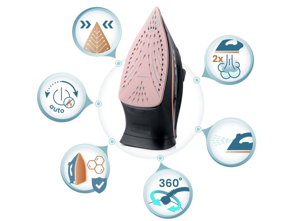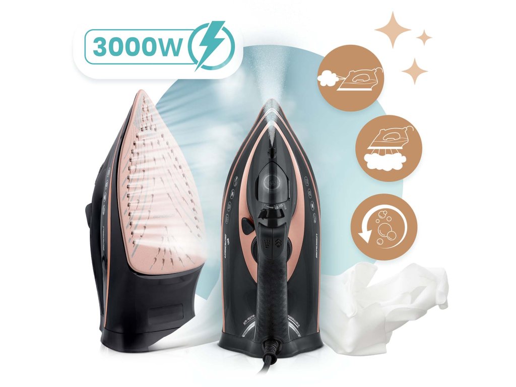 PÂNĂ LA 3000 W PUTERE | DUBLA EVACUARE A ABURULUI | AUTO-CURĂȚARE | PROTECȚIE SUPRAÎNCĂLZIRE | REZERVOR DE APĂ 360 ML | ABUR VERTICAL | REGLARE TEMPERATURĂ | AUTO-OFF