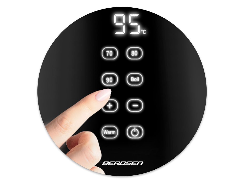 Ceainicul are pe capac un panou tactil mare cu butoane funcționale: