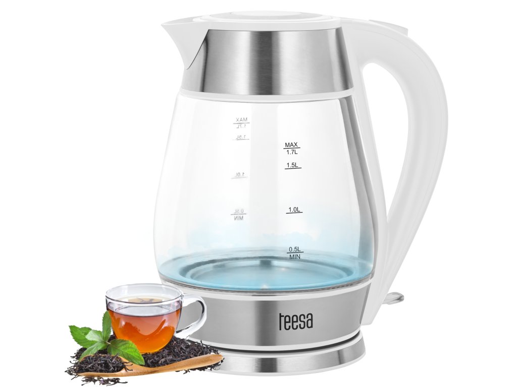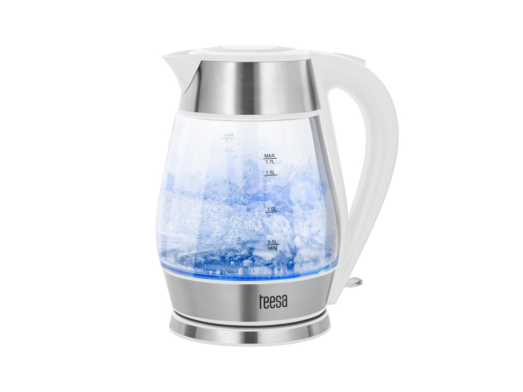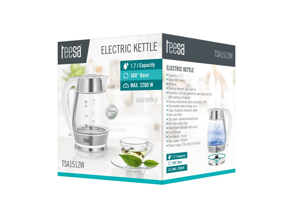 Dacă nu știți ce să alegeți între un fierbător electric sau unul tradițional, vă recomandăm modelul TSA1512. Acest fierbător din sticlă cu un volum mare de 1,7 litri și o putere de 2200 W vă permite să fierbeți rapid apă pentru o băutură caldă pentru întreaga familie. Iar dacă aveți poftă să petreceți seara singuri cu o ceașcă de ceai preferat, elementul de încălzire plat al fierbătorului wireless Teesa vă permite să fierbeți și o cantitate mică de apă.