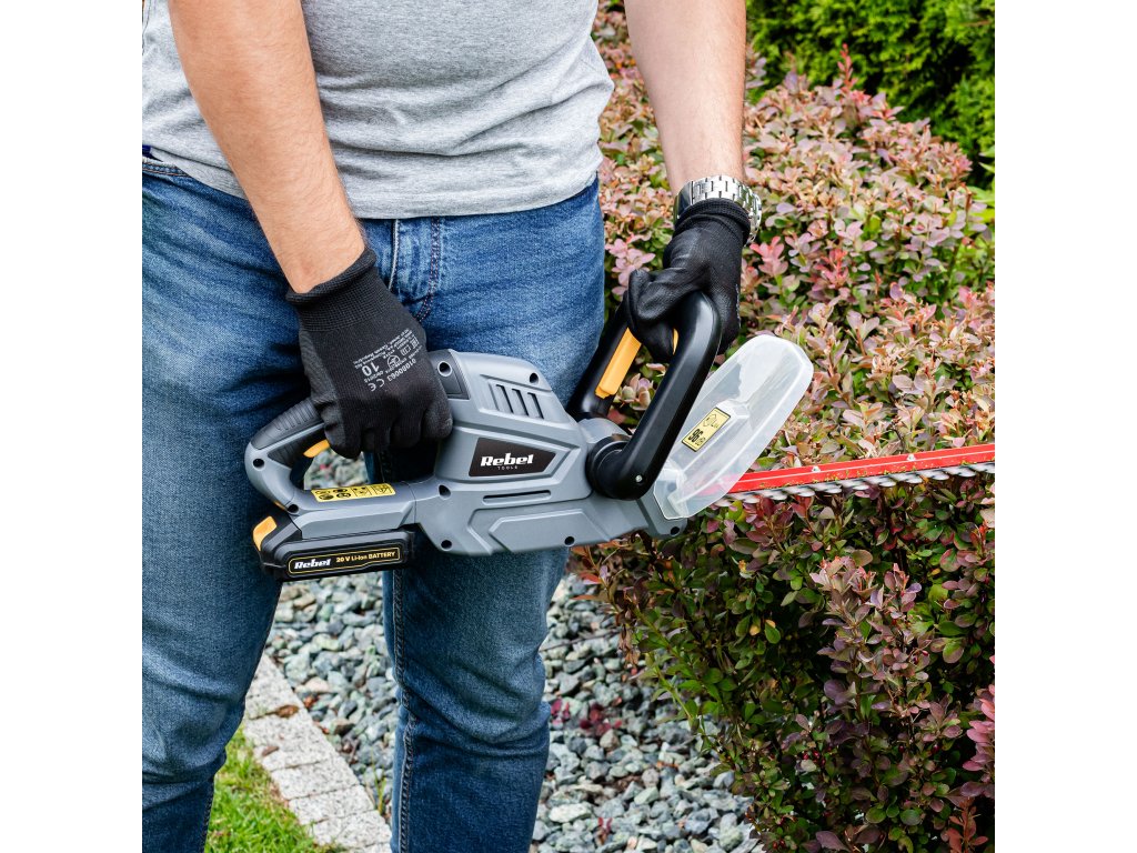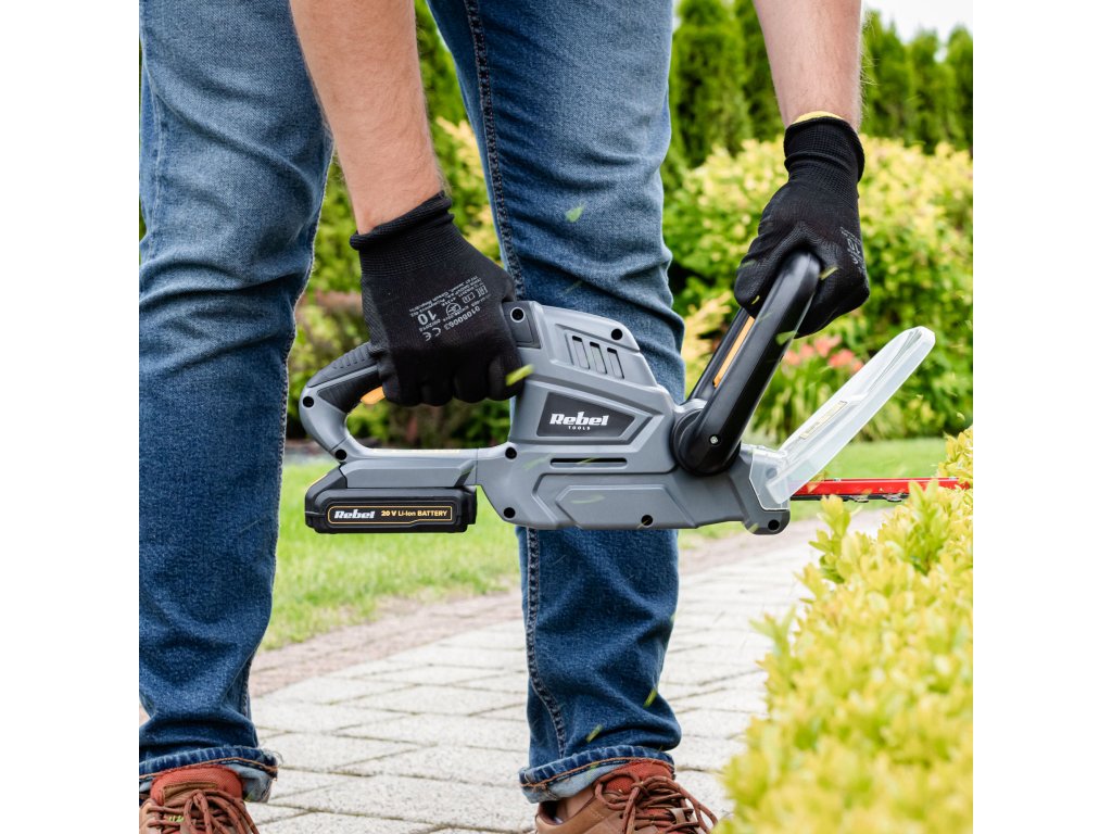 Dacă depuneți mult efort pentru a menține tufișurile și gardurile vii din grădina dvs. frumos tăiate, avem ceva care vă va ajuta să economisiți mult timp și efort! Înlocuiți foarfeca manuală tradițională cu o foarfecă cu acumulator pentru gard viu din gama Rebel Tools. Acest aparat este echipat cu o lamă din oțel de 520 mm tăiată cu laser, care tunde rapid, confortabil și precis chiar și un gard viu larg. Pentru un confort și siguranță sporite, foarfeca este echipată cu un mâner frontal și un scut de protecție.