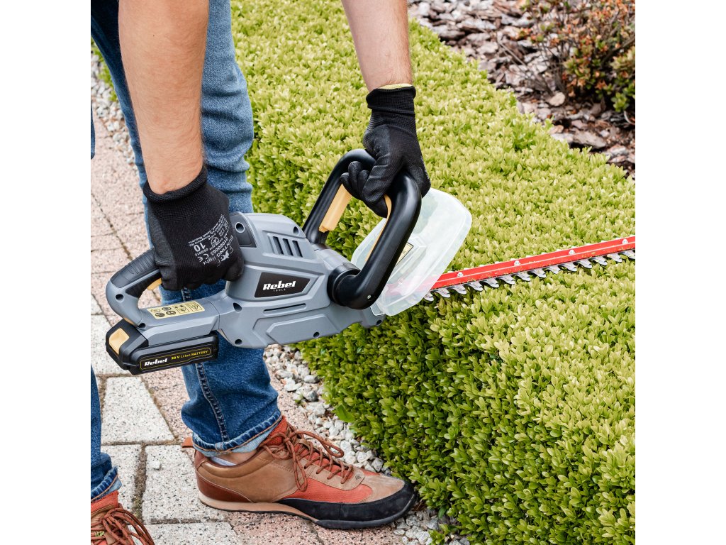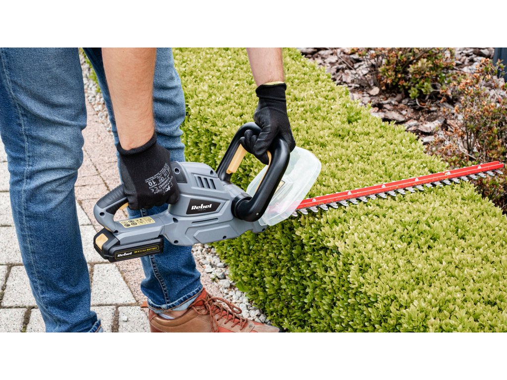 Dacă depuneți mult efort pentru a menține tufișurile și gardurile vii din grădina dvs. frumos tăiate, avem ceva care vă va ajuta să economisiți mult timp și efort! Înlocuiți foarfeca manuală tradițională cu o foarfecă cu acumulator pentru gard viu din gama Rebel Tools. Acest aparat este echipat cu o lamă din oțel de 520 mm tăiată cu laser, care tunde rapid, confortabil și precis chiar și un gard viu larg. Pentru un confort și siguranță sporite, foarfeca este echipată cu un mâner frontal și un scut de protecție.Uitați de cablul încurcat! Aparatul este fără fir, pentru a fi ușor de manevrat și confortabil în utilizare. Bateria litiu-ion cu o capacitate de 2 Ah are o durată lungă de viață și oferă până la o oră de funcționare. Foarfeca dispune de un indicator al stării de încărcare a bateriei, astfel încât puteți monitoriza timpul de lucru.