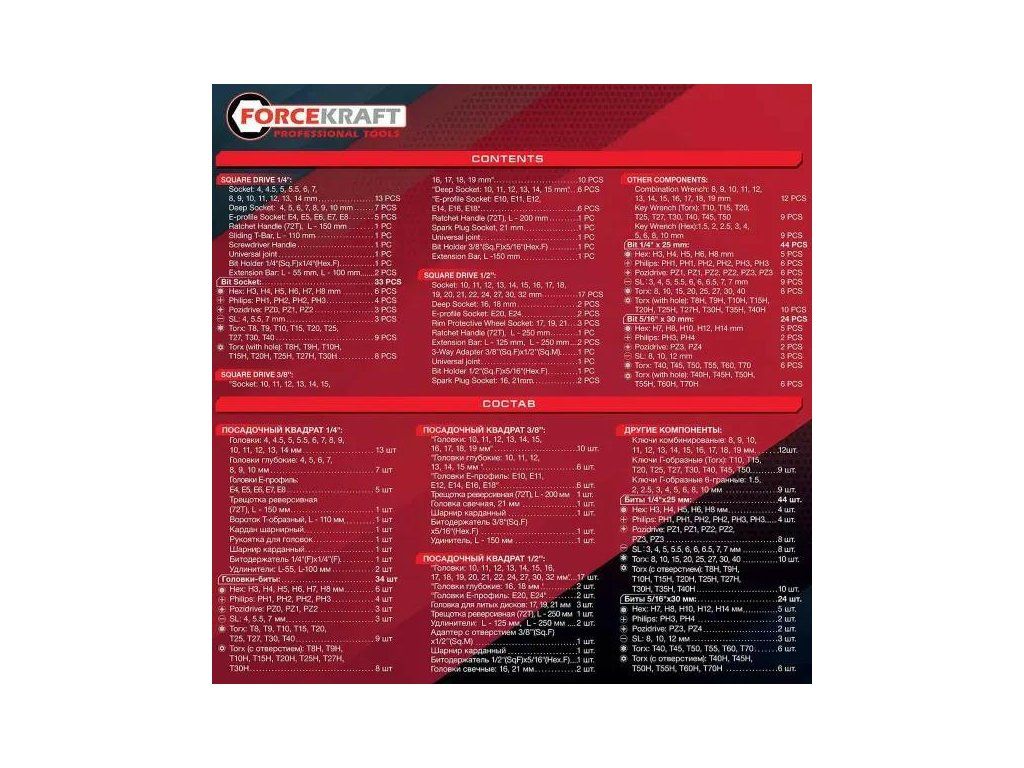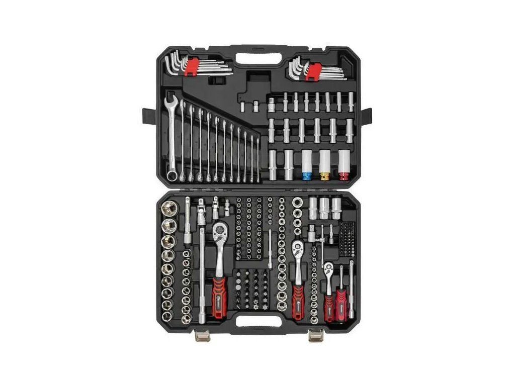 Setul conține o gamă largă de accesorii cu 6-fațete (4–32 mm), extensii, război, cuplaje, biți, chei, adaptoare și alte accesorii, ceea ce permite realizarea aproape oricărei reparații. Include dimensiuni în trei standarde – 1/4”, 3/8” și 1/2”, făcându-l universal și compatibil cu diferite unelte.