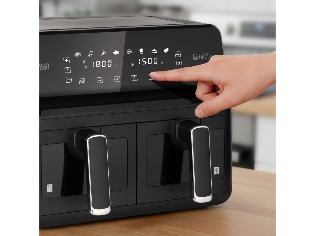 Friteuza Teesa AIR FRYER DUAL POT XXL are 7 programe predefinite, care ajustează automat timpul și temperatura pentru mâncarea aleasă. Cartofi prăjiți, pui, pește, legume — este nevoie de un singur click, iar aparatul se ocupă de restul.