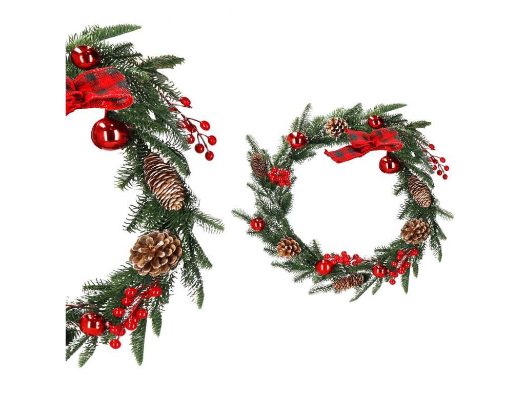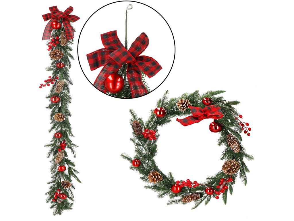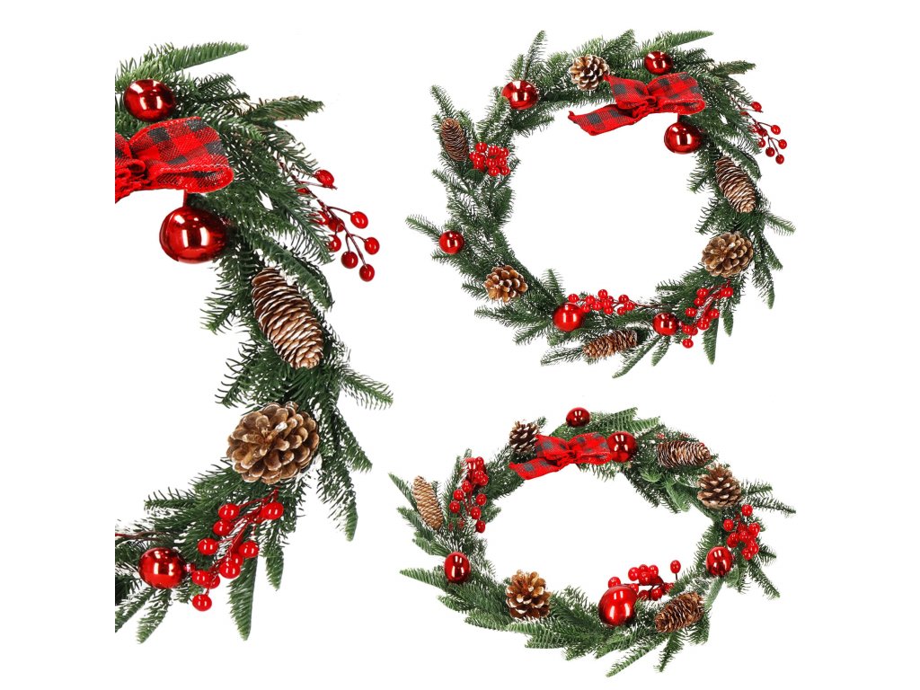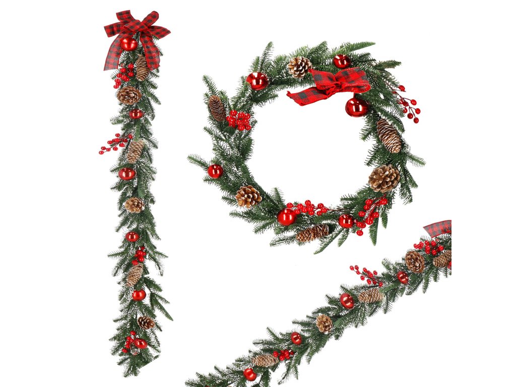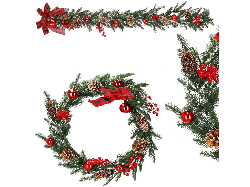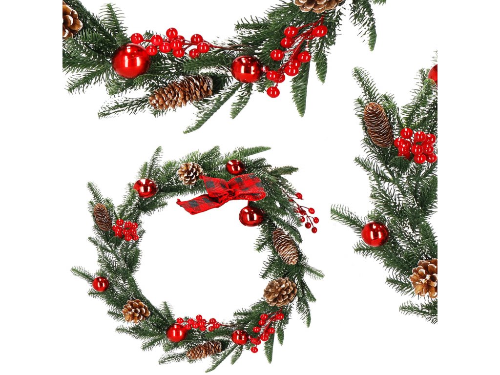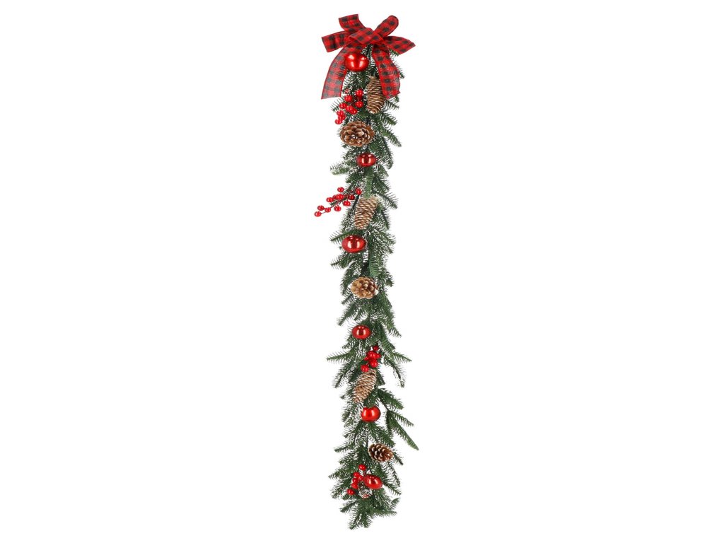 Model: ghirlandă decorată cu conuri de brad, crenguțe de sorb și biluțe roșii; fundă în carouri la un capăt