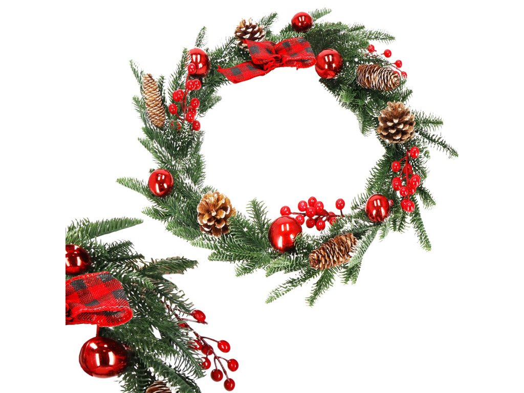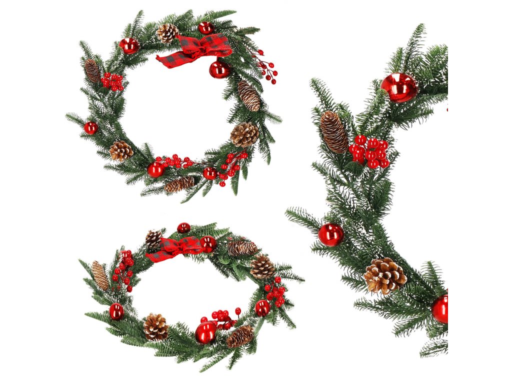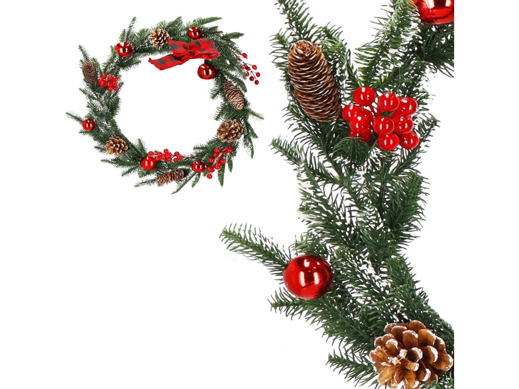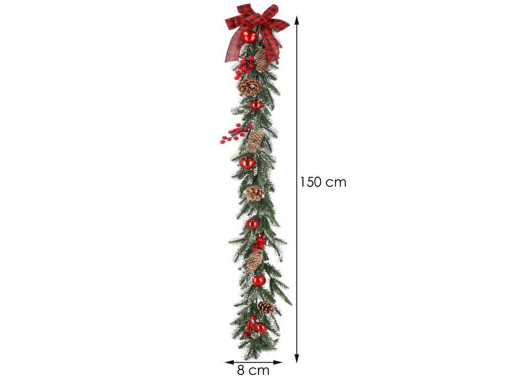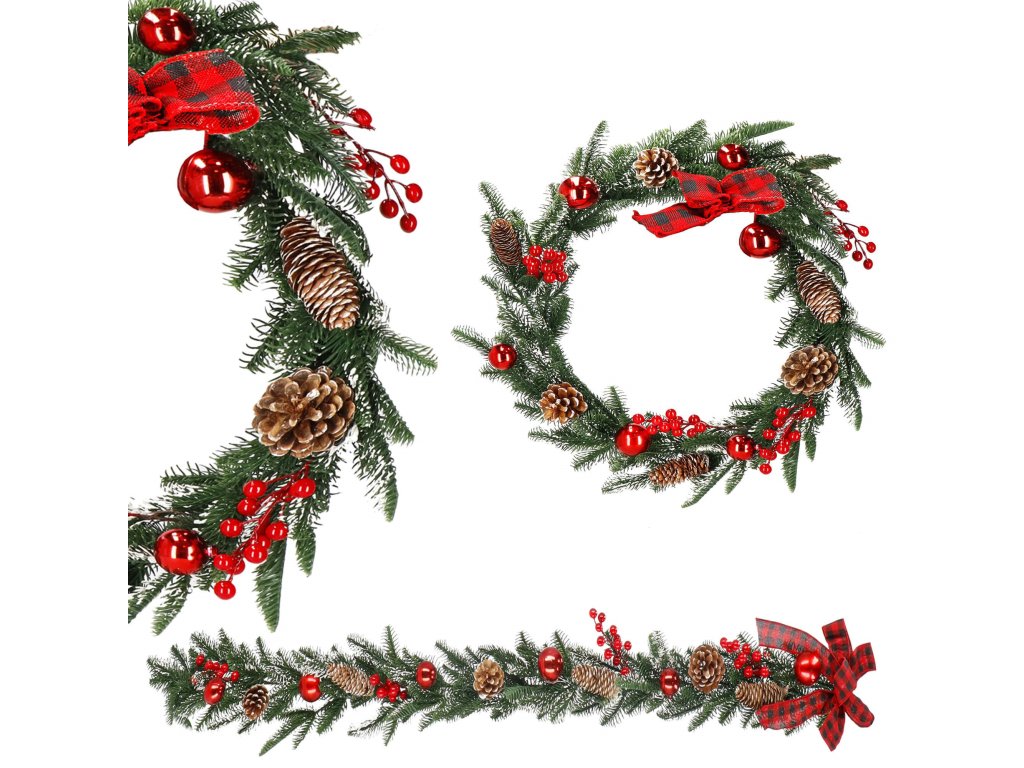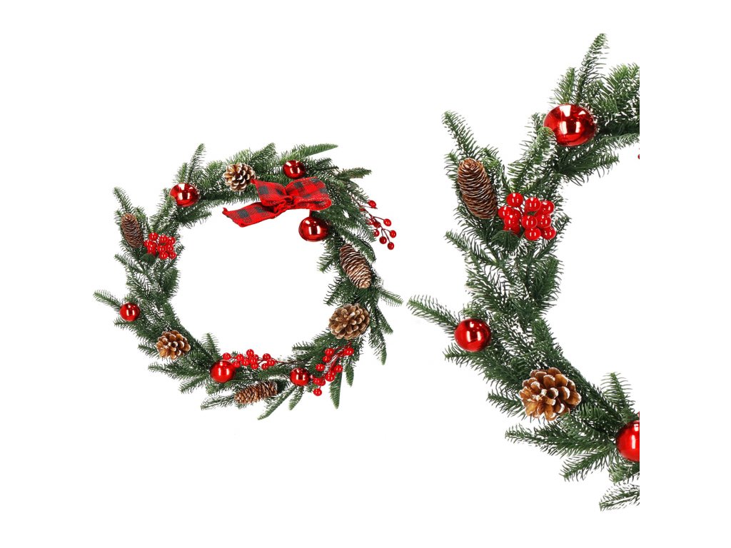 Model: ghirlandă decorată cu conuri de brad, crenguțe de sorb și biluțe roșii; fundă în carouri la un capăt