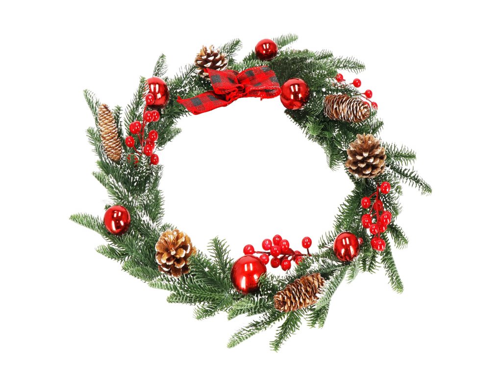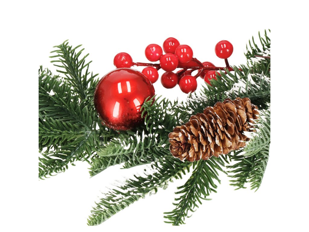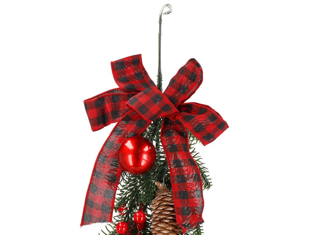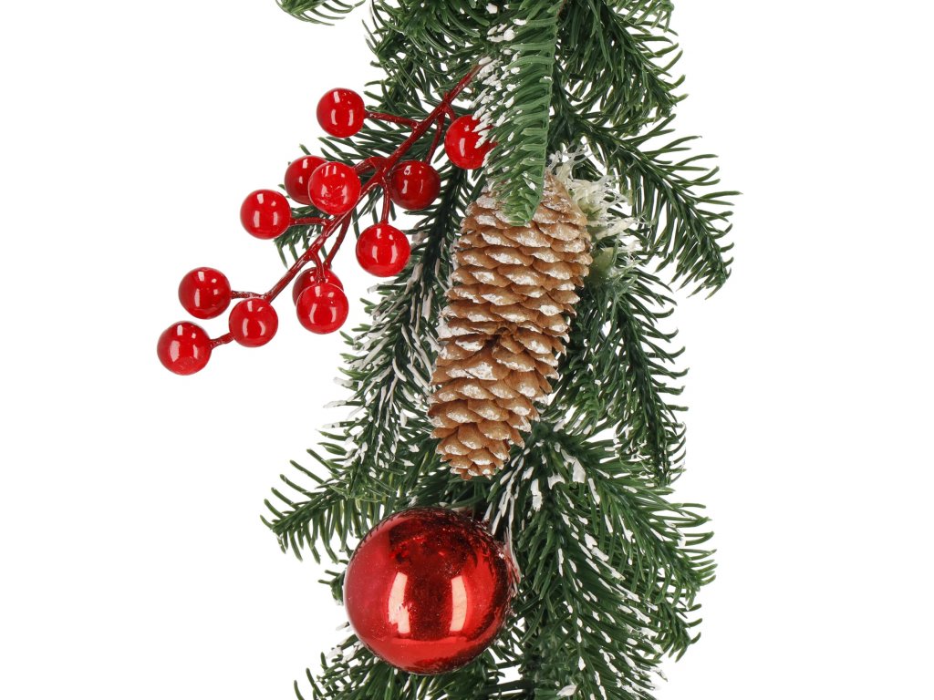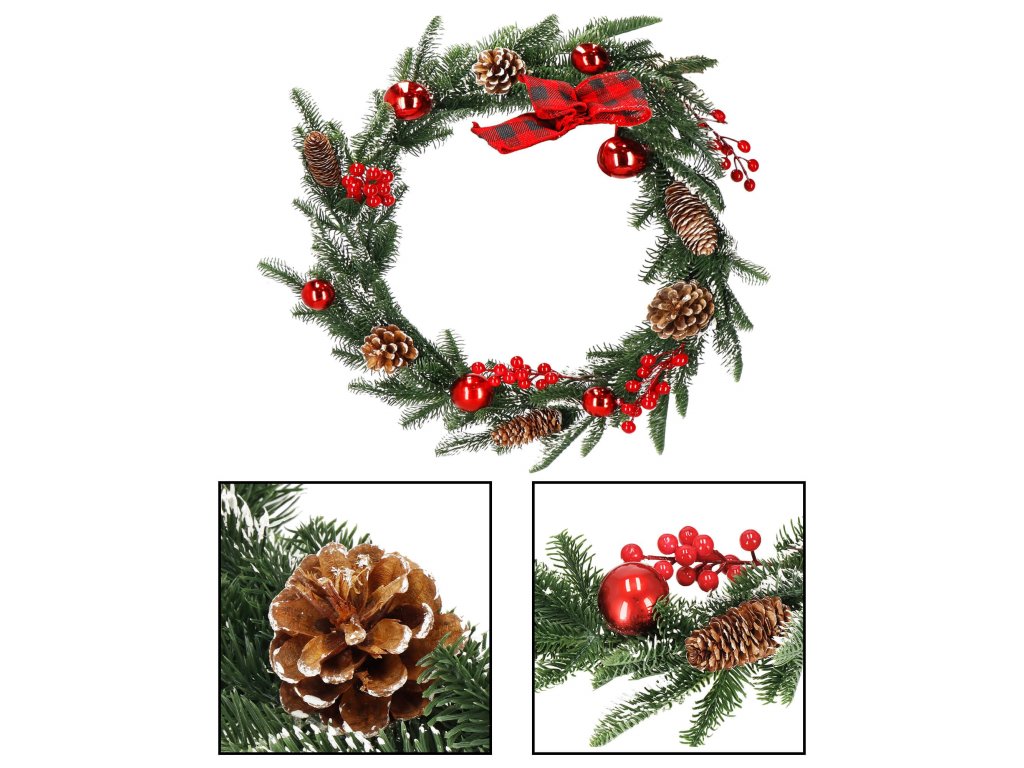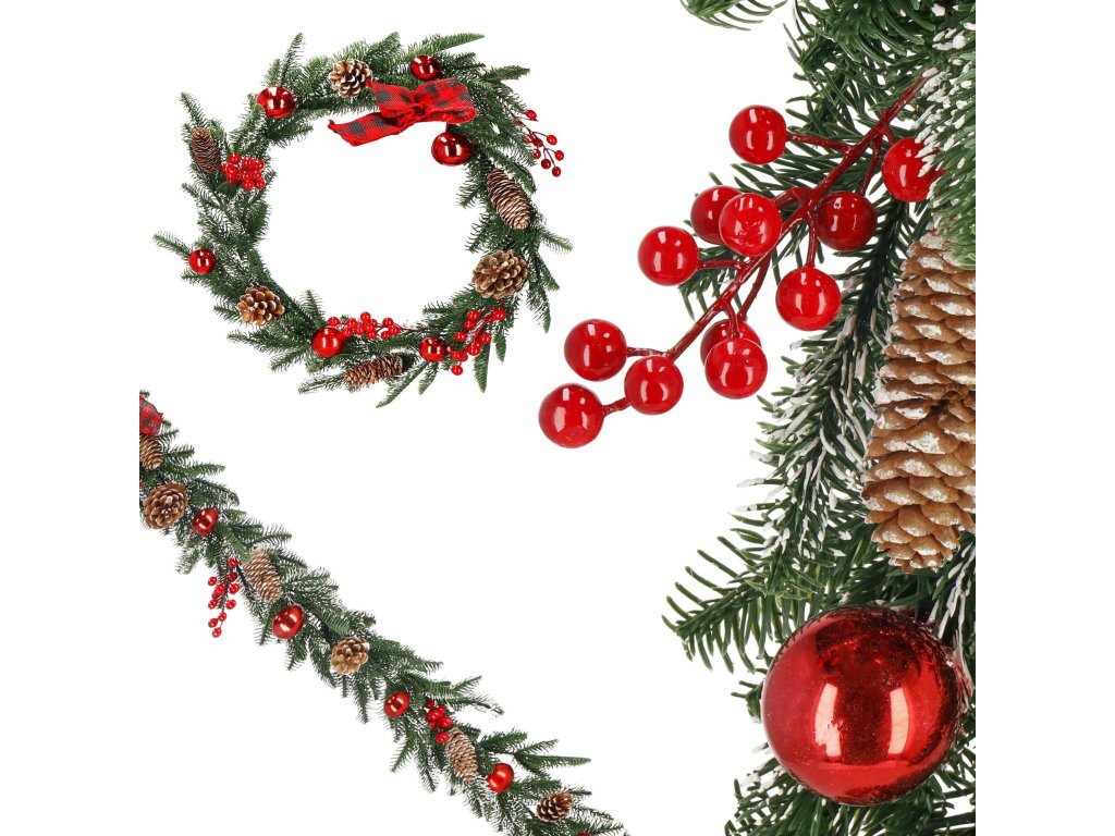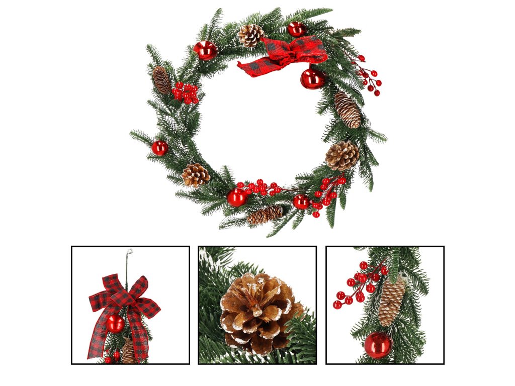 Model: ghirlandă decorată cu conuri de brad, crenguțe de sorb și biluțe roșii; fundă în carouri la un capăt
