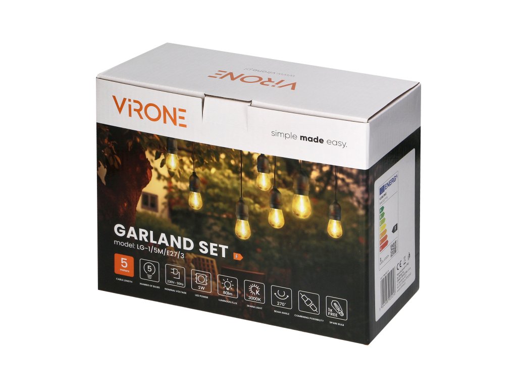 - Počet a typ žiaroviek: Cu 6 becuri LED durabile de tip E27 cu puterea de 1W fiecare, această ghirlandă oferă o lumină albă caldă (3000K) care creează o atmosferă plăcută și intimă.