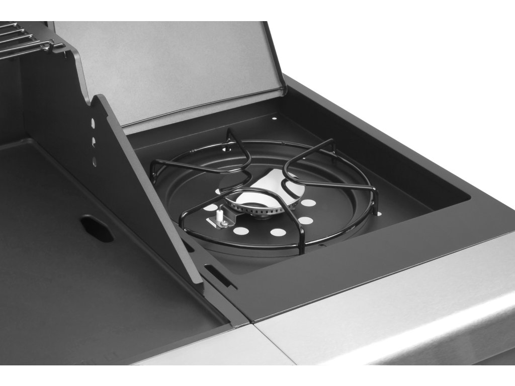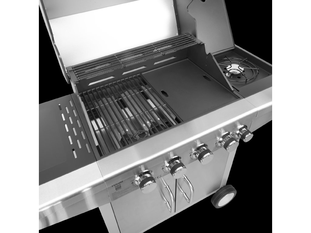 Sub grătarul pentru grătare al grătarului Teesa BBQ 500 Master se află 4 arzătoare cu o putere totală de 14,4 kW. Dar asta nu e tot! Una dintre suprafețele de lucru ascunde un alt arzător de 3 kW, care permite, de exemplu, prepararea sosurilor pentru mâncărurile la grătar.